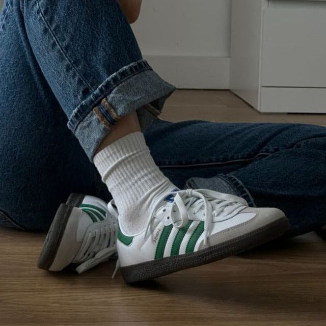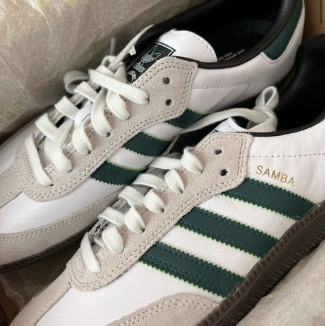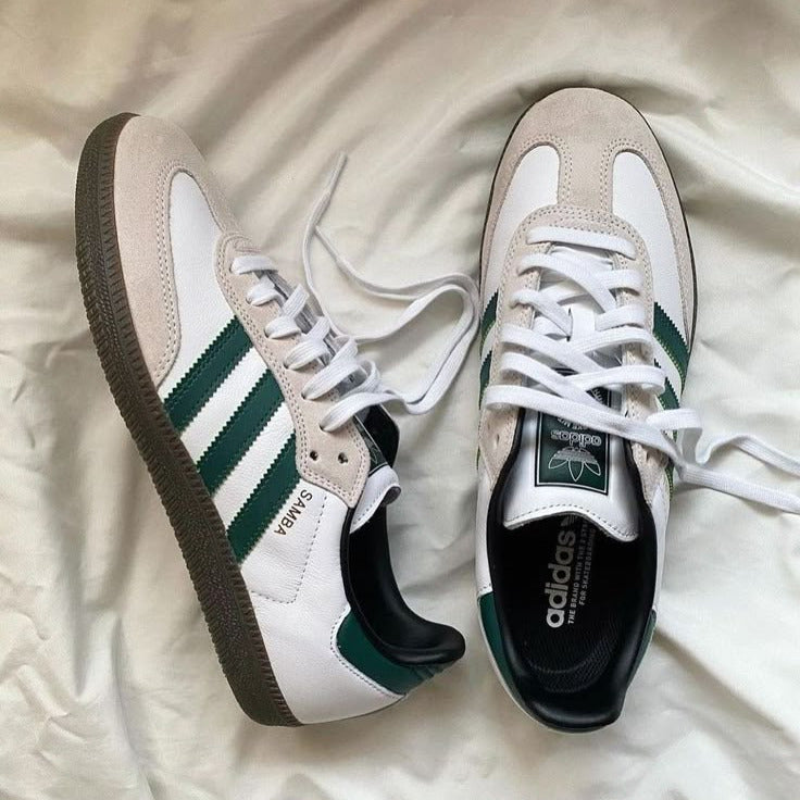 The Adidas Samba OG 'Cloud White Collegiate Green' is a timeless refresh of the 1950s indoor soccer icon. This colorway leans into the shoe's "terrace" heritage, utilizing a classic collegiate palette that feels both athletic and academic. It remains one of the most sought-after iterations for its ability to anchor a clean, minimalist wardrobe with a sharp pop of traditional green.
