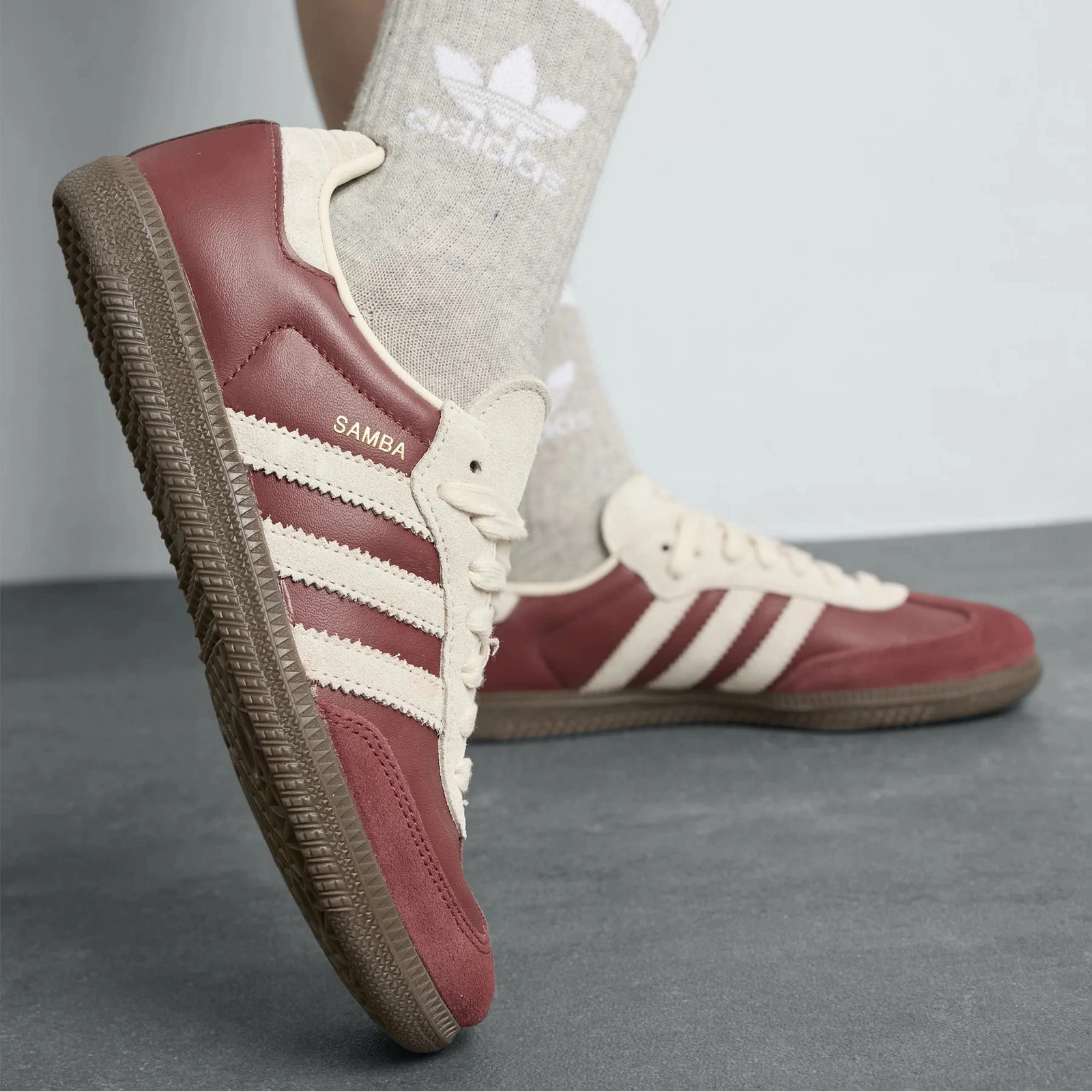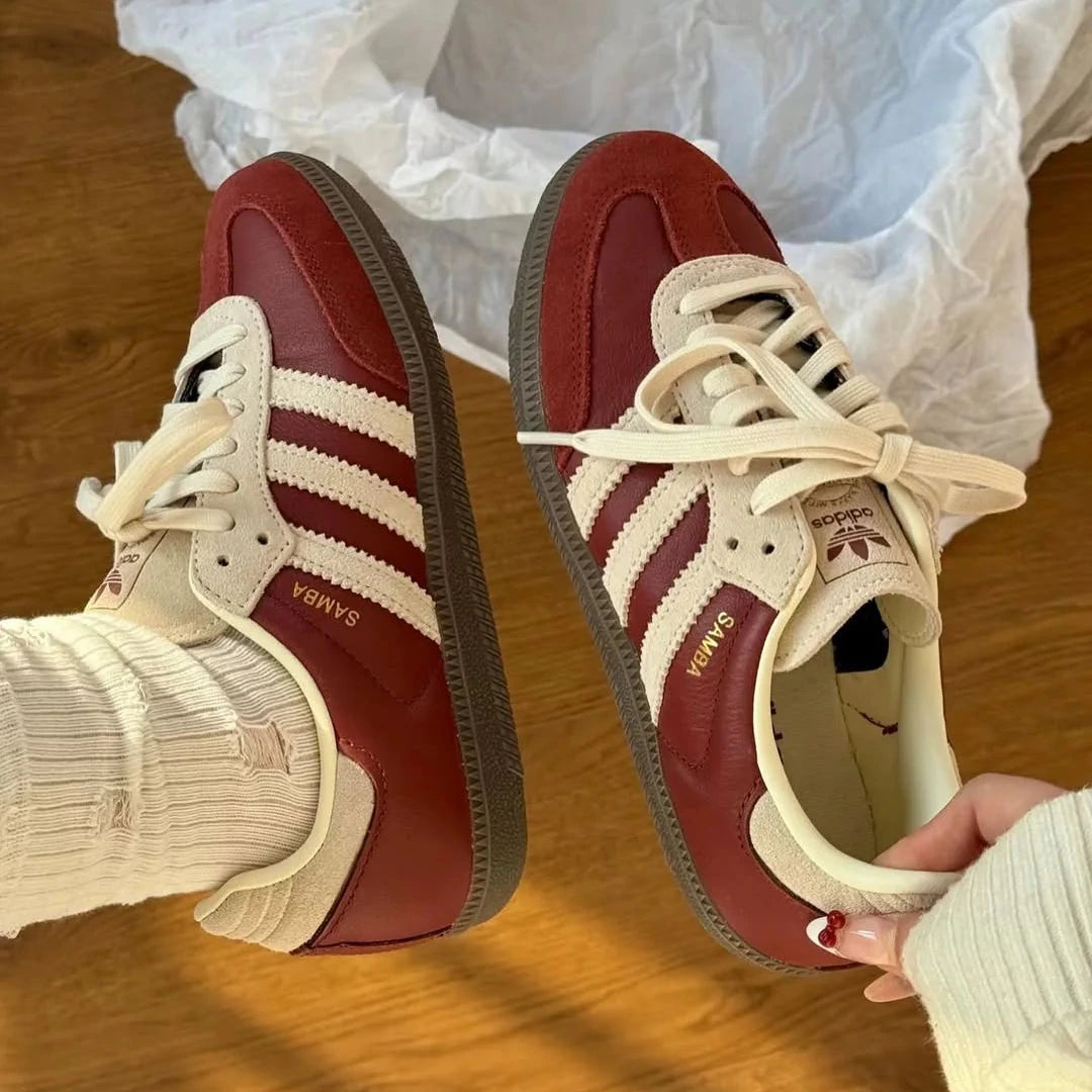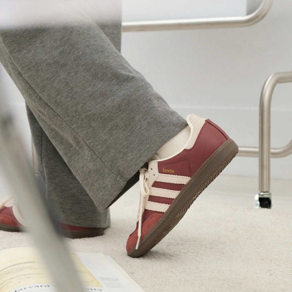The Adidas Samba OG 'Preloved Ruby Cream White' is a vintage-inspired take on the iconic 1950s indoor soccer silhouette. This edition moves away from the traditional high-contrast black and white, opting instead for a saturated, heritage-rich color palette that evokes a "found in the archives" feel.