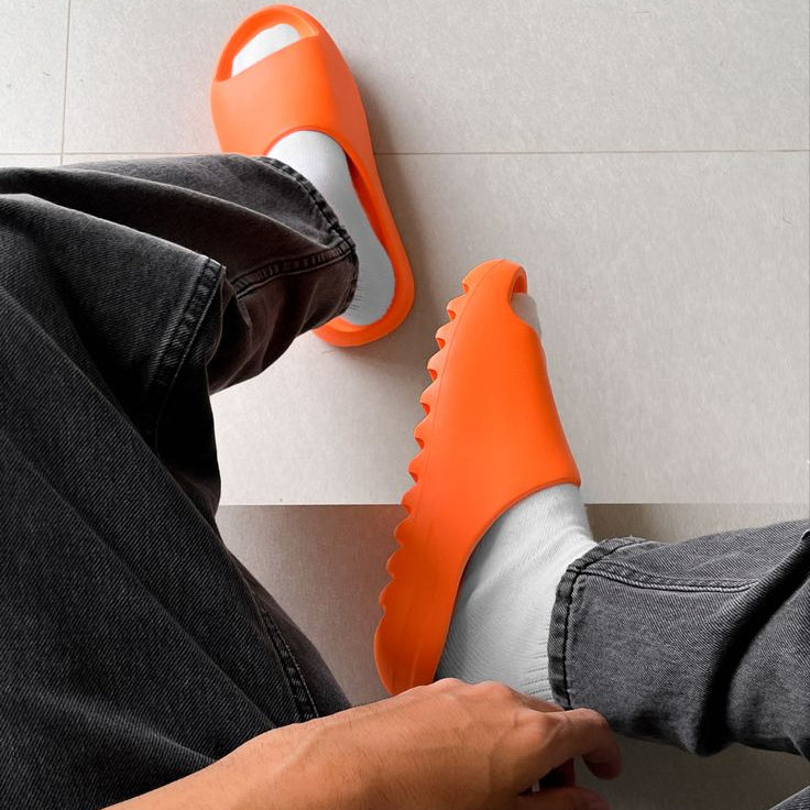 This is a piece of the sun, for your feet. The Adidas Yeezy Slide in "Enflame Orange" is a tribute to the raw, untamed power of a solar flare.