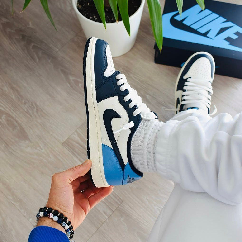 The Air Jordan 1 Low OG Obsidian UNC revisits court heritage with classic blue and white hues.