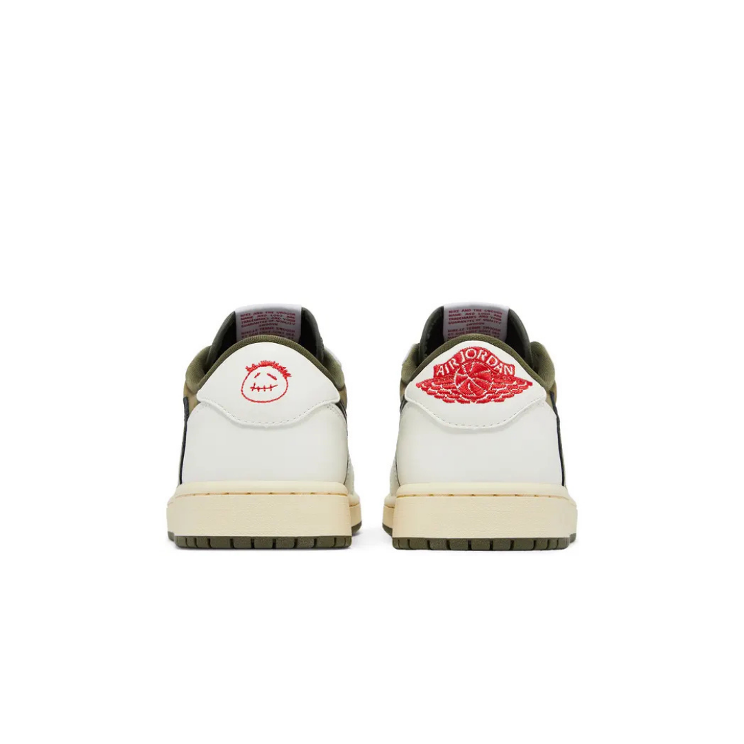 This Travis Scott x Air Jordan 1 Low OG Medium Olive features classic design elements like the iconic Swoosh logo and a contrasting white midsole. The reversed Swoosh on the lateral side adds a unique touch, while the signature Cactus Jack logo on the tongue and heel further elevates the style.
