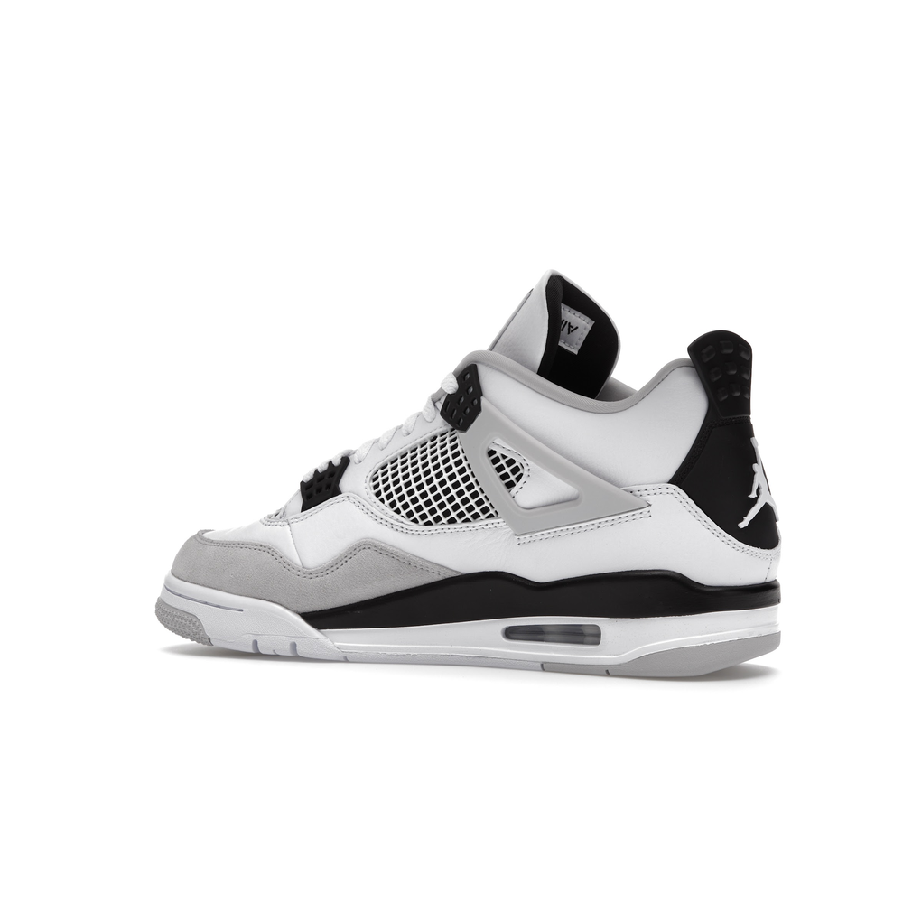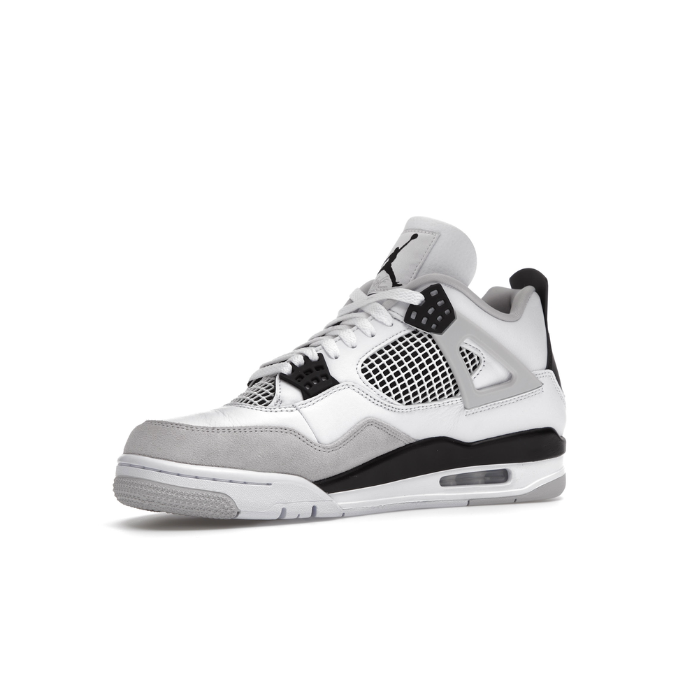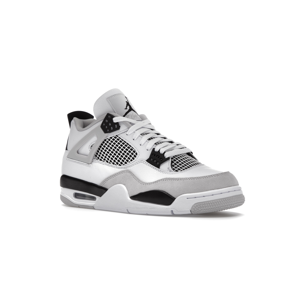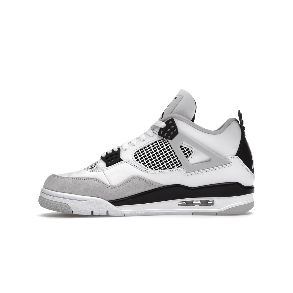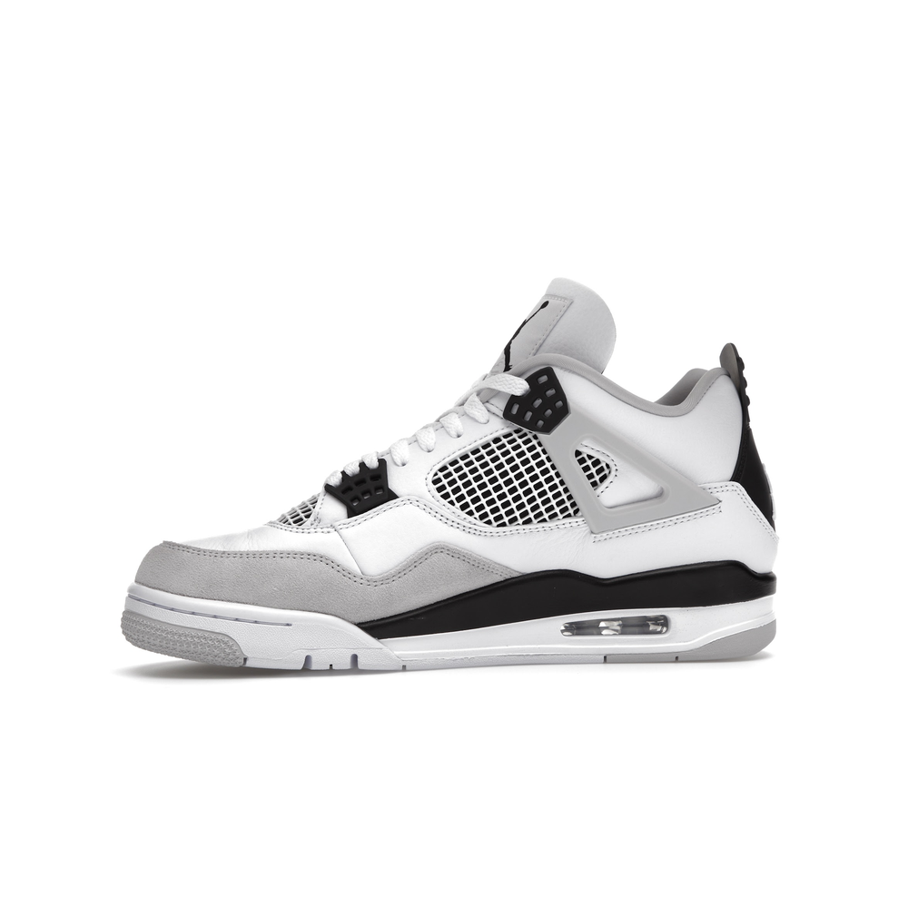 Drawing inspiration from the Air Jordan 4 Military Blue, the Military Black version boasts a smooth white leather upper, complemented by a light grey Durabuck toe wrap and netted TPU inserts. The Military Black eyelets, heel tabs, and underlays provide a striking contrast to the clean upper. The design is finished off with a white, black, and light grey sole, featuring a visible Air unit for added comfort and style.