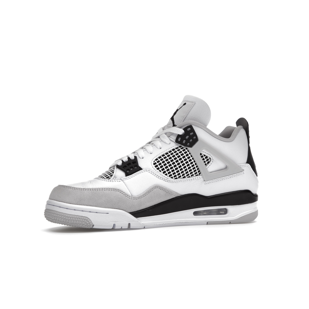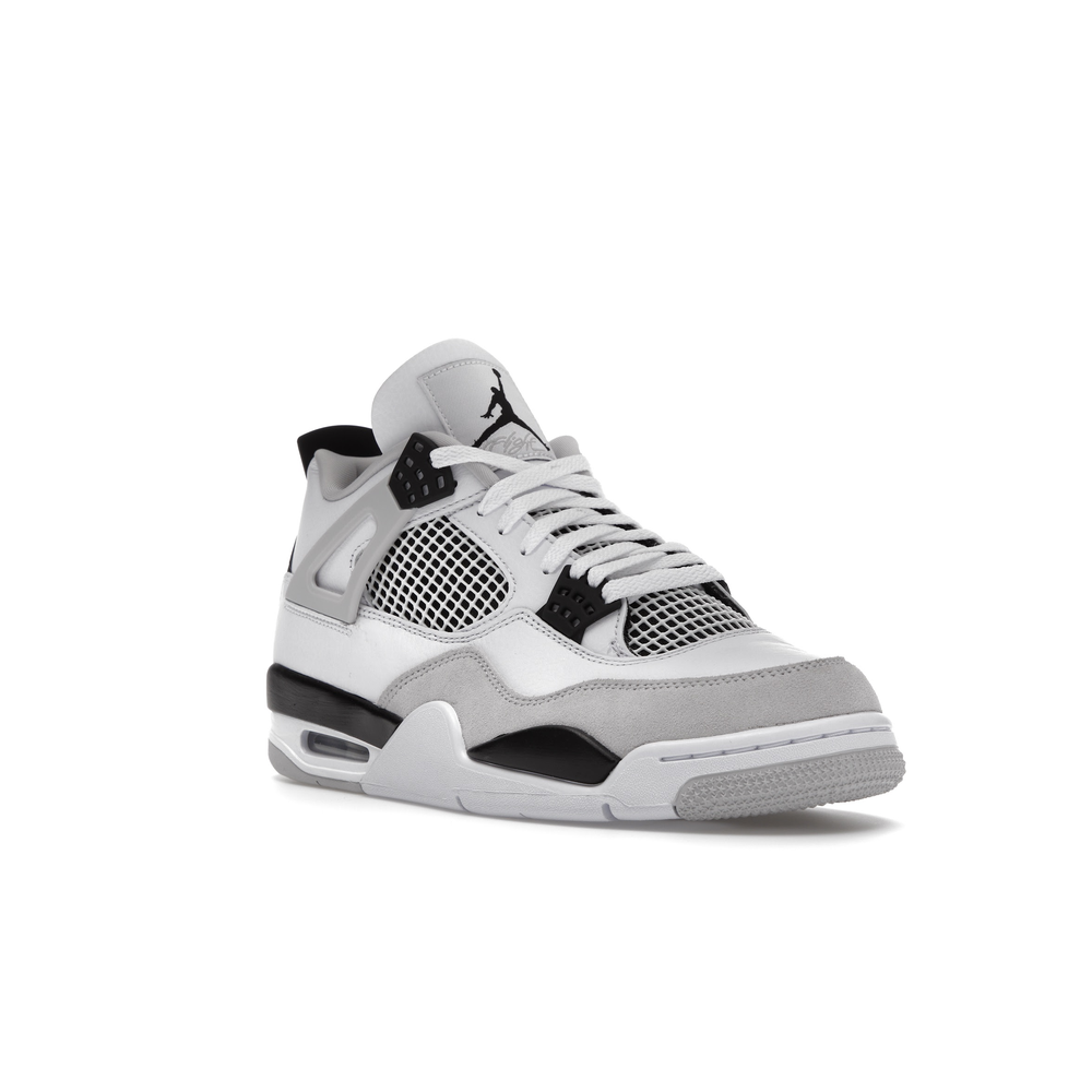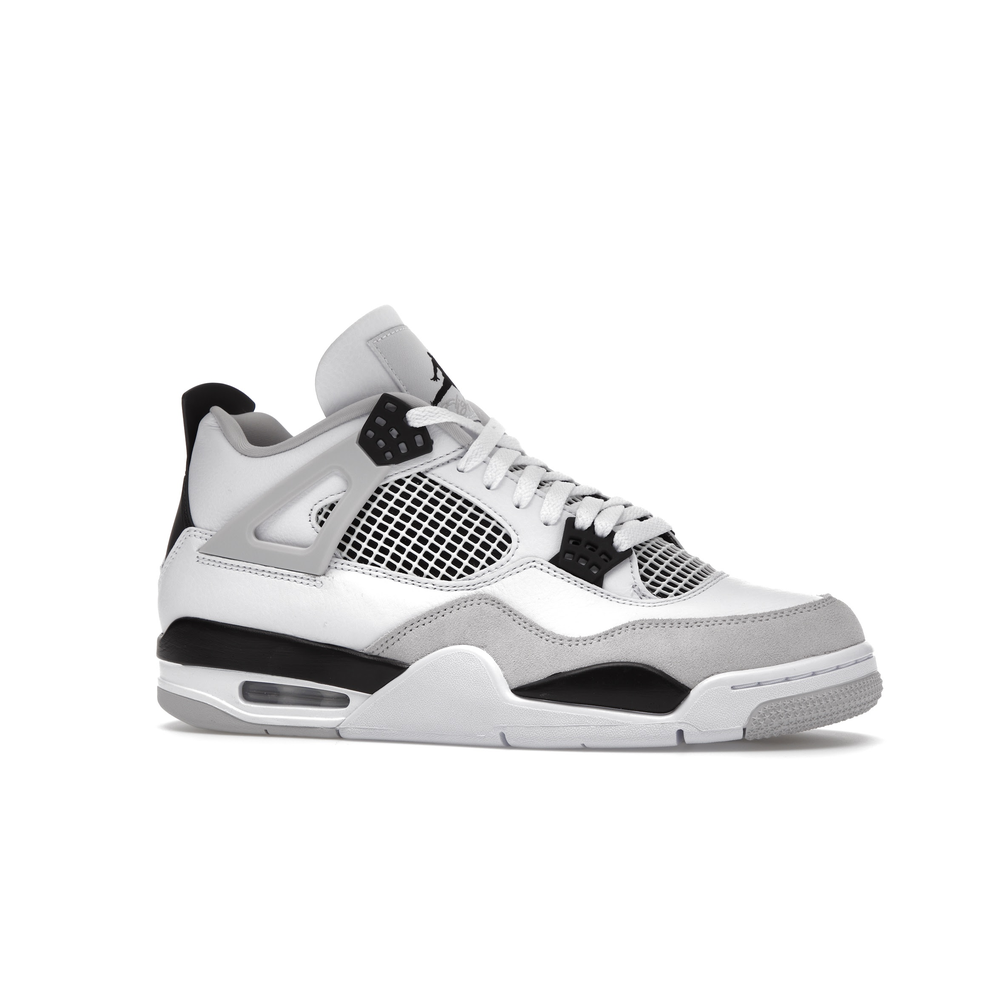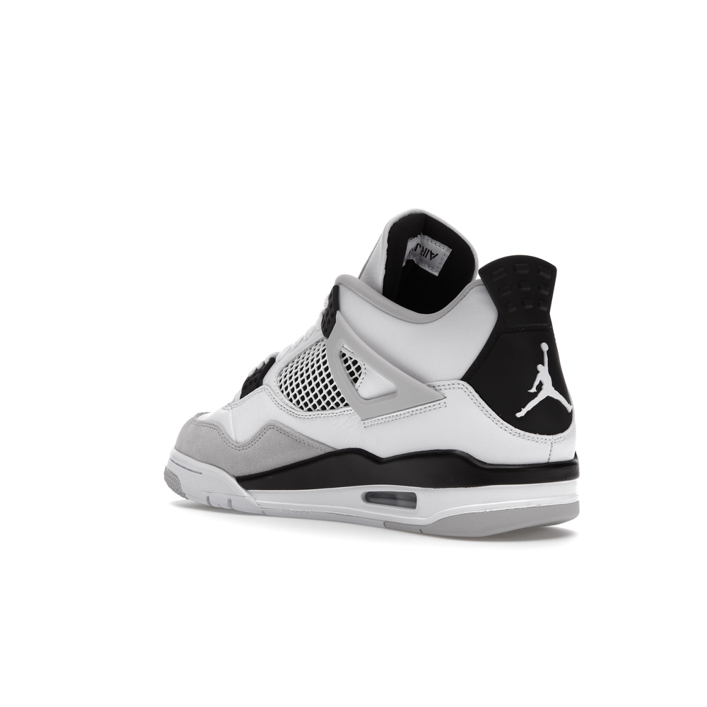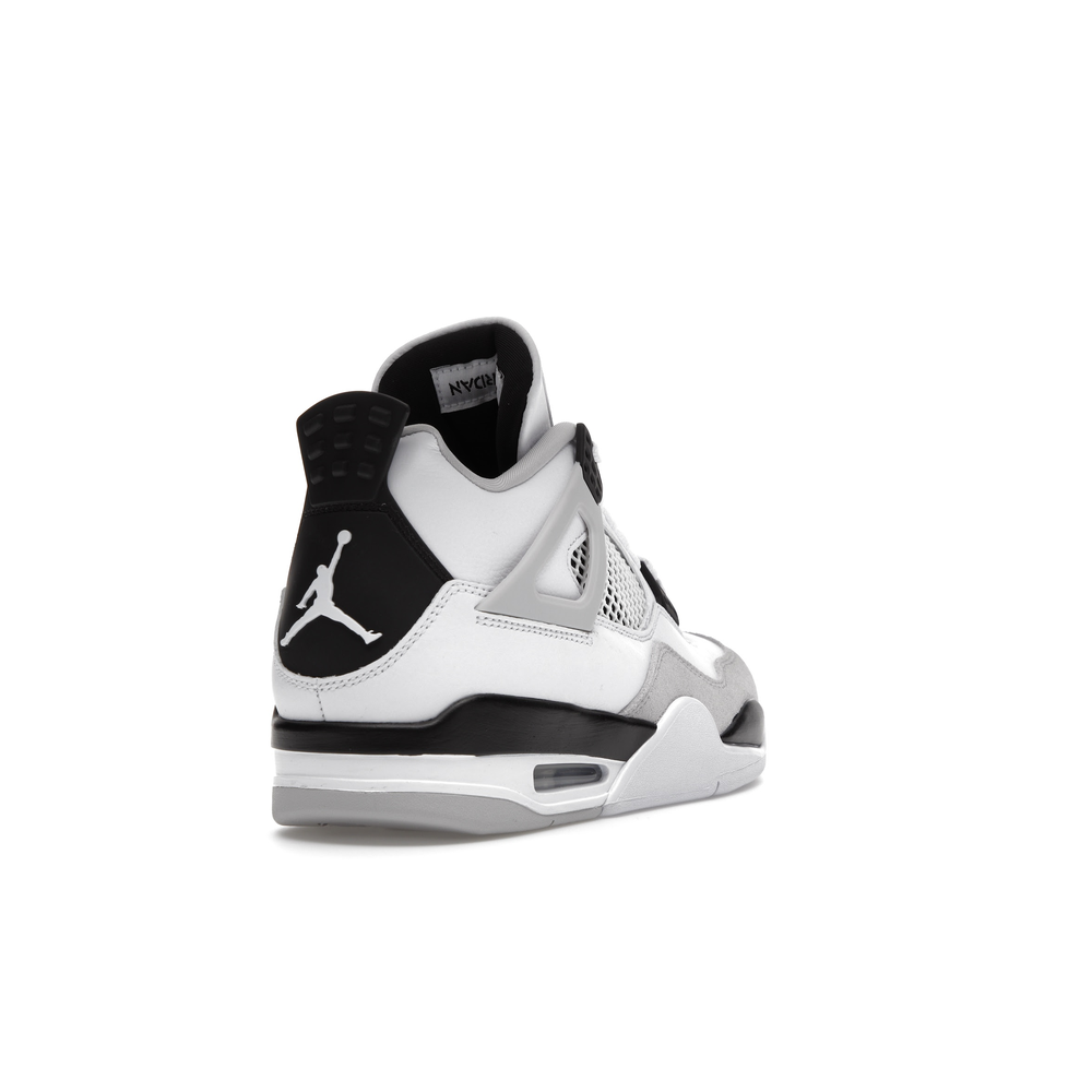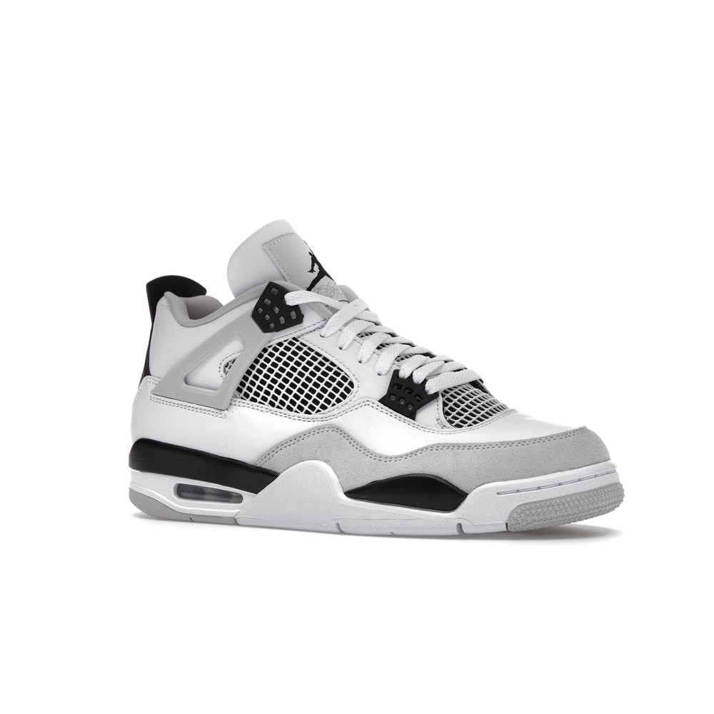 Drawing inspiration from the Air Jordan 4 Military Blue, the Military Black version boasts a smooth white leather upper, complemented by a light grey Durabuck toe wrap and netted TPU inserts. The Military Black eyelets, heel tabs, and underlays provide a striking contrast to the clean upper. The design is finished off with a white, black, and light grey sole, featuring a visible Air unit for added comfort and style.
