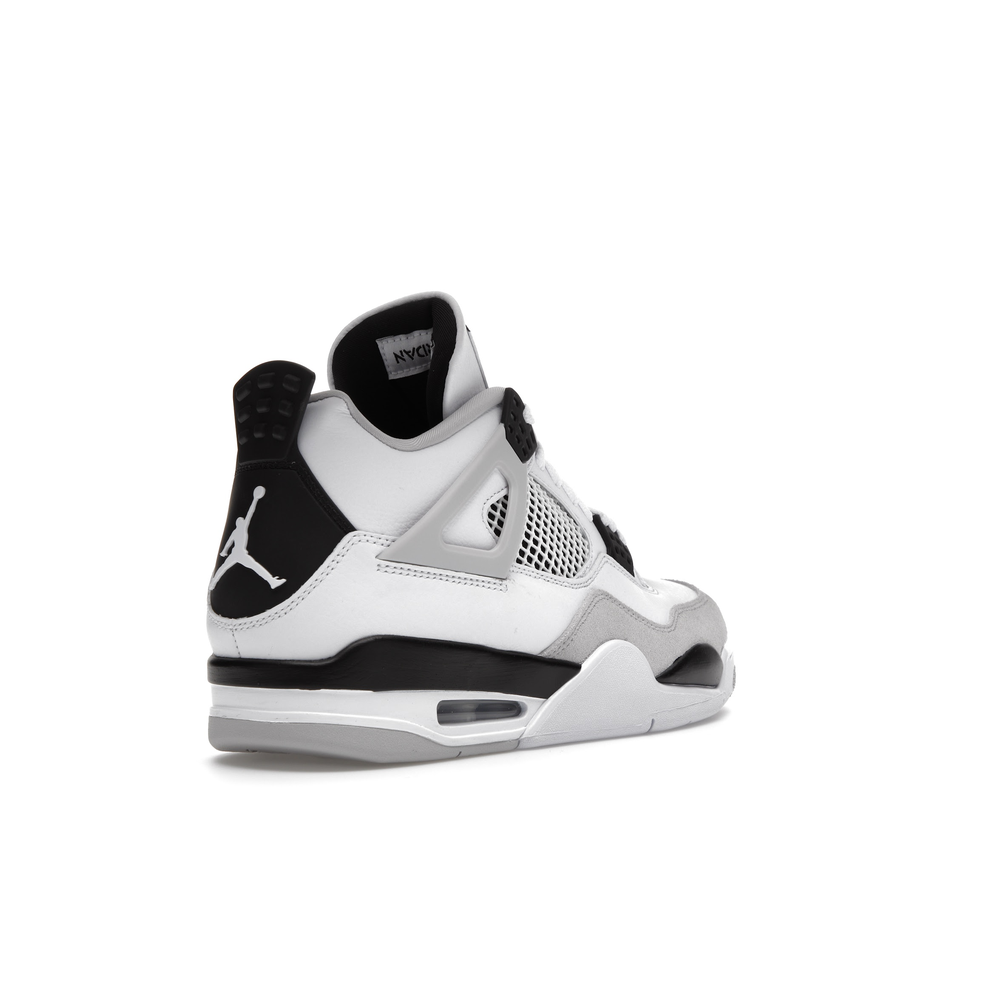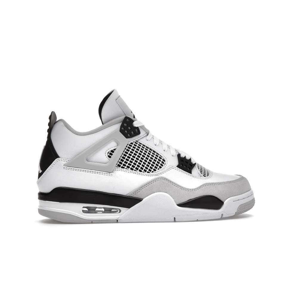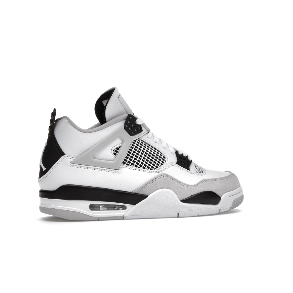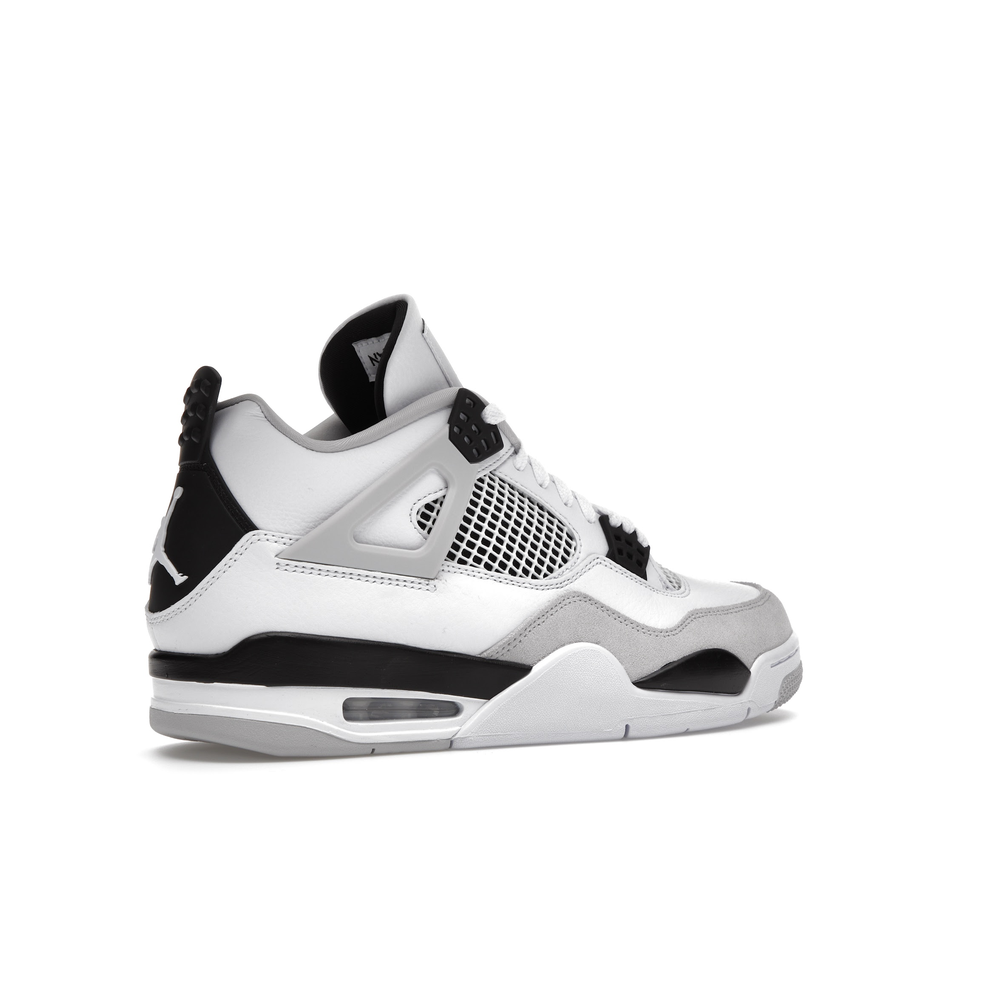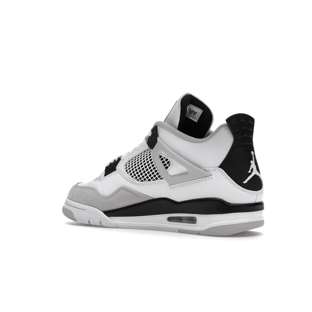 Drawing inspiration from the Air Jordan 4 Military Blue, the Military Black version boasts a smooth white leather upper, complemented by a light grey Durabuck toe wrap and netted TPU inserts. The Military Black eyelets, heel tabs, and underlays provide a striking contrast to the clean upper. The design is finished off with a white, black, and light grey sole, featuring a visible Air unit for added comfort and style.