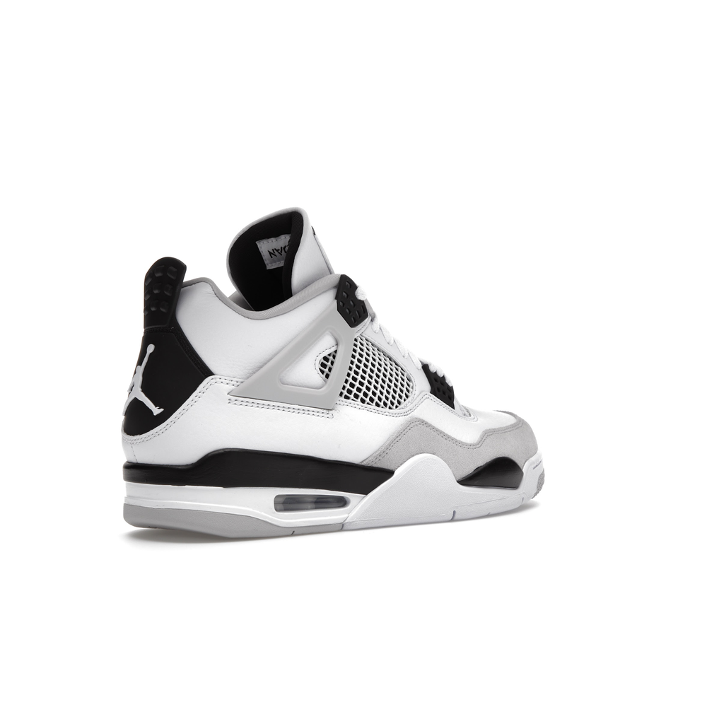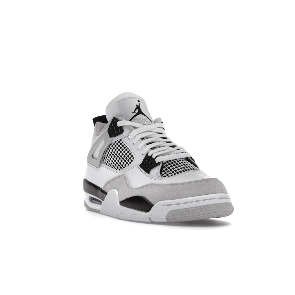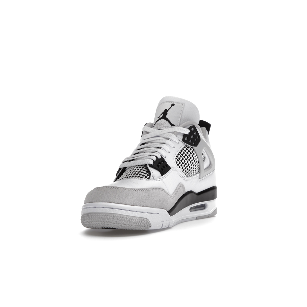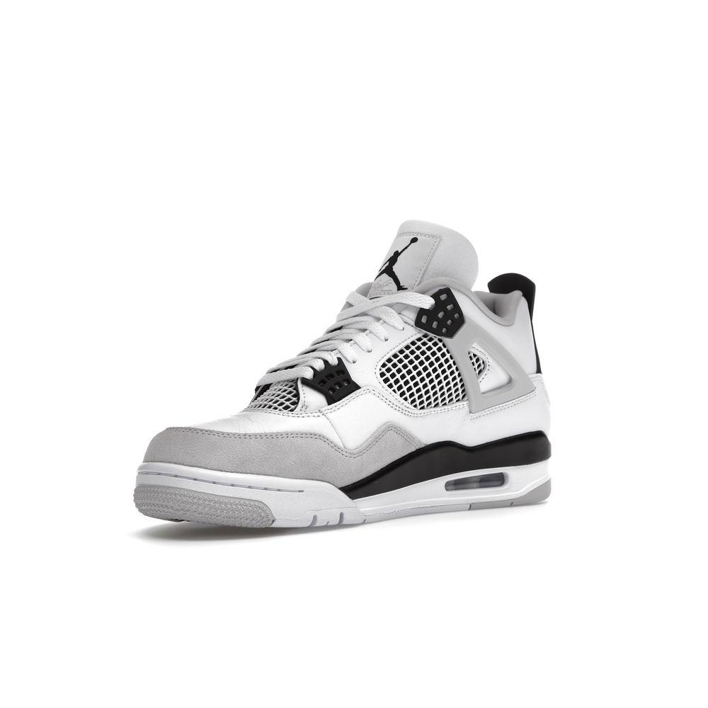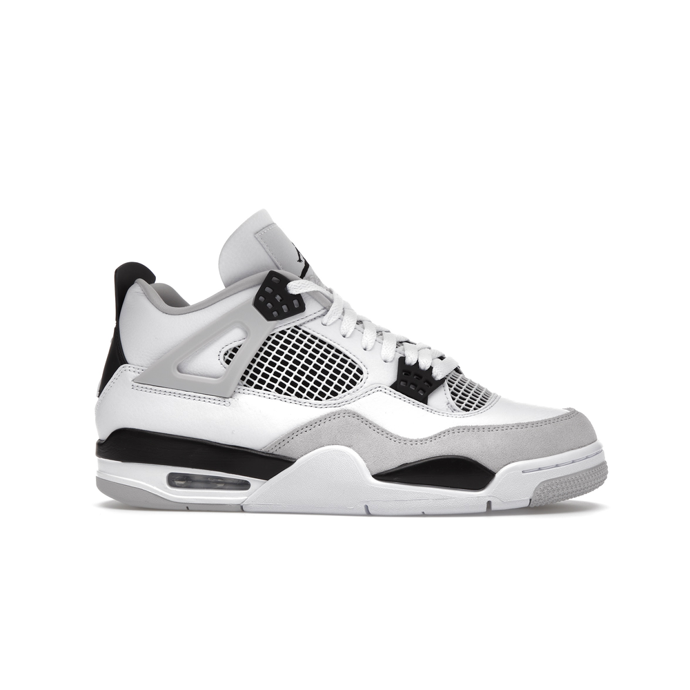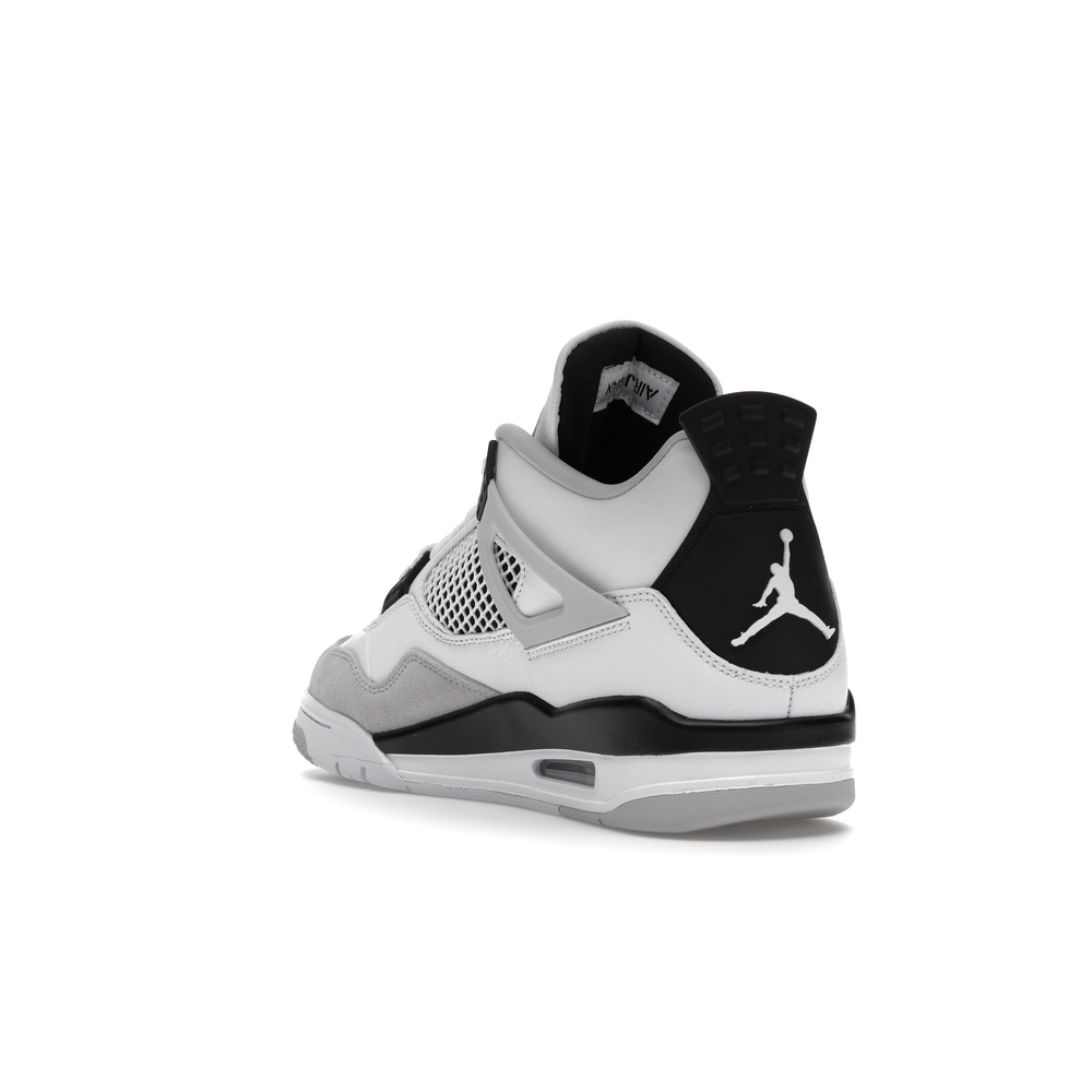 Drawing inspiration from the Air Jordan 4 Military Blue, the Military Black version boasts a smooth white leather upper, complemented by a light grey Durabuck toe wrap and netted TPU inserts. The Military Black eyelets, heel tabs, and underlays provide a striking contrast to the clean upper. The design is finished off with a white, black, and light grey sole, featuring a visible Air unit for added comfort and style.