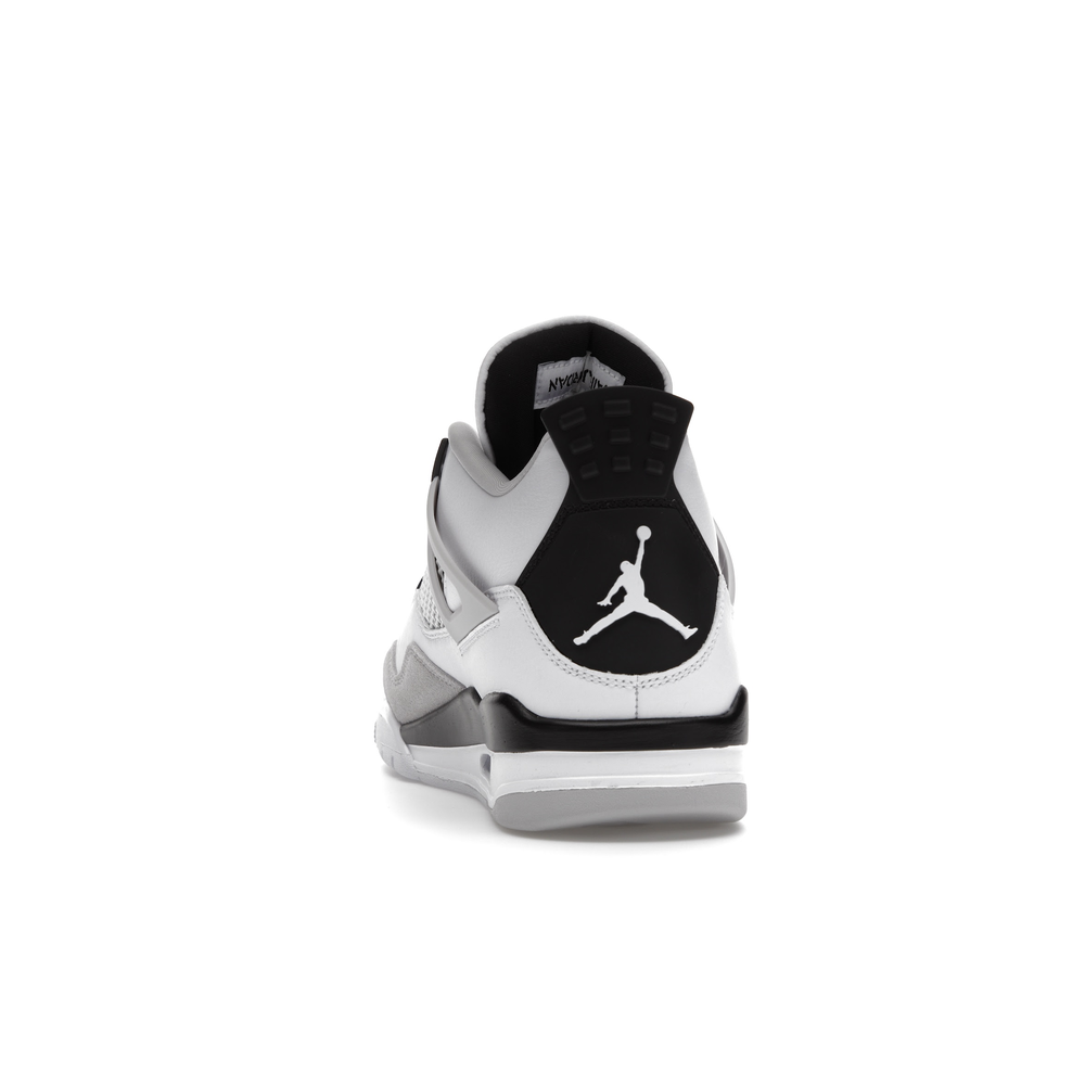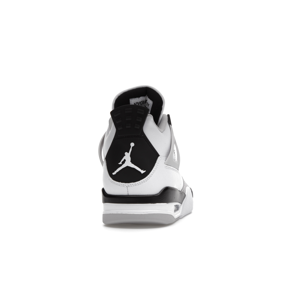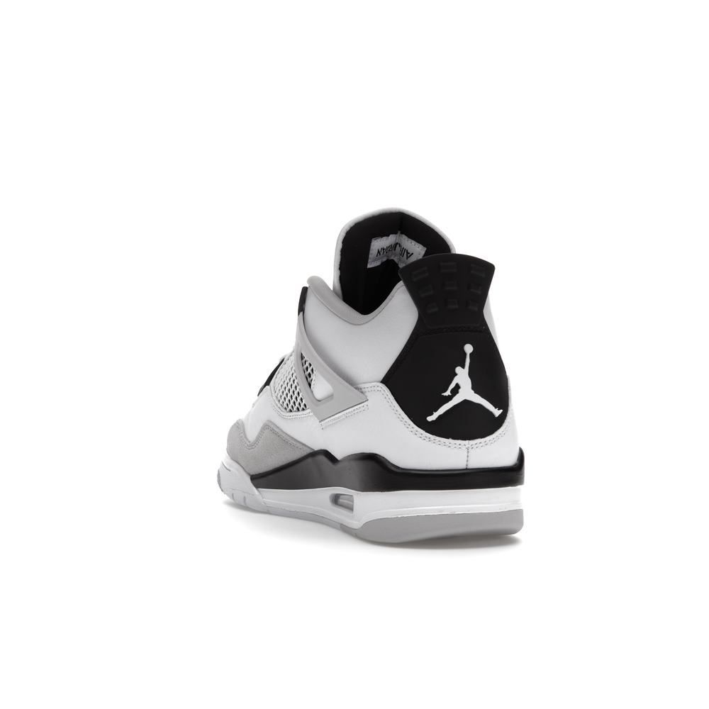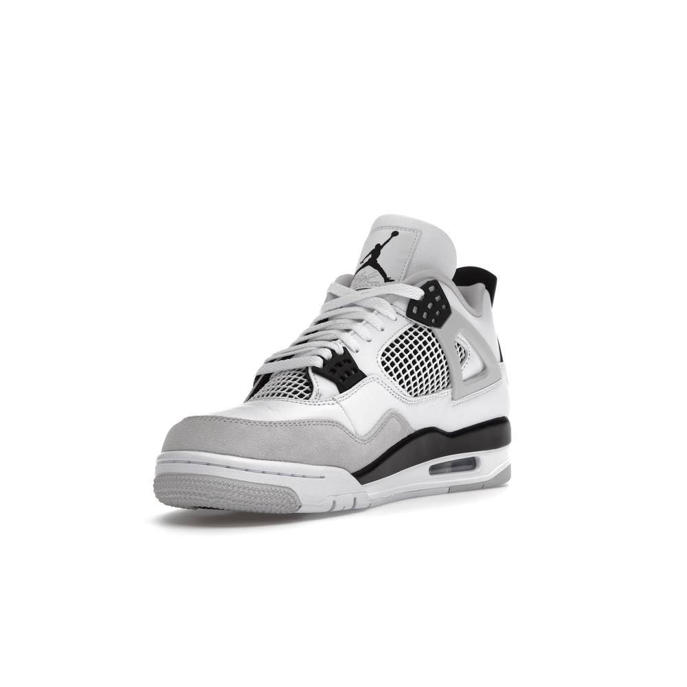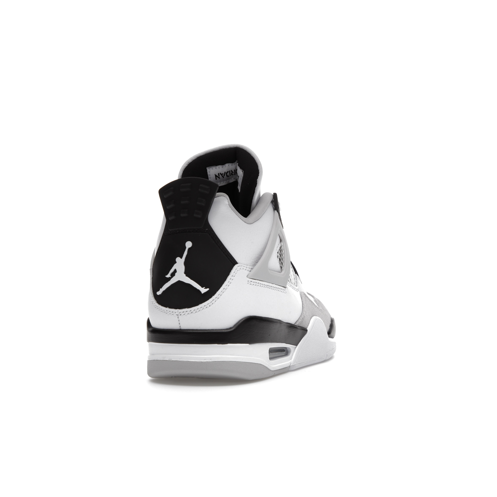 Drawing inspiration from the Air Jordan 4 Military Blue, the Military Black version boasts a smooth white leather upper, complemented by a light grey Durabuck toe wrap and netted TPU inserts. The Military Black eyelets, heel tabs, and underlays provide a striking contrast to the clean upper. The design is finished off with a white, black, and light grey sole, featuring a visible Air unit for added comfort and style.