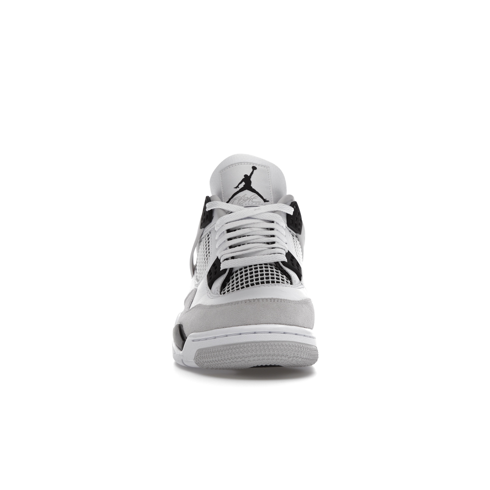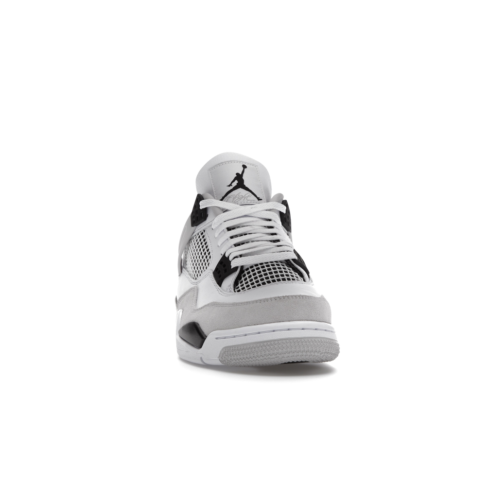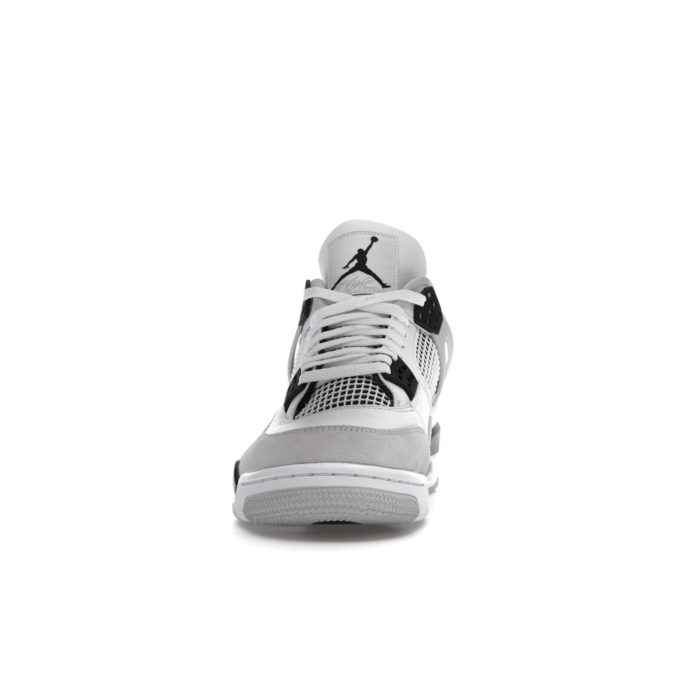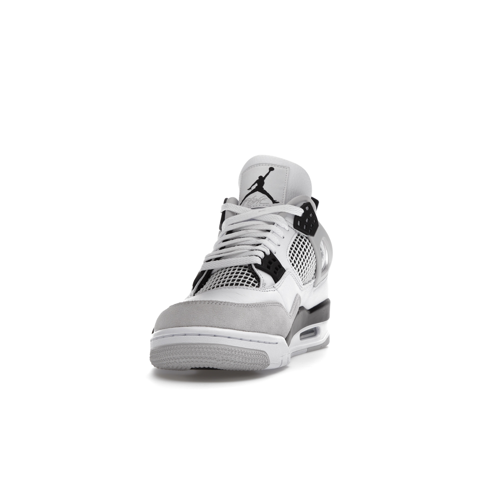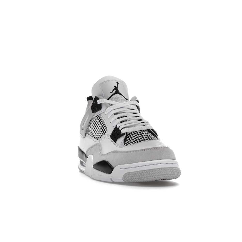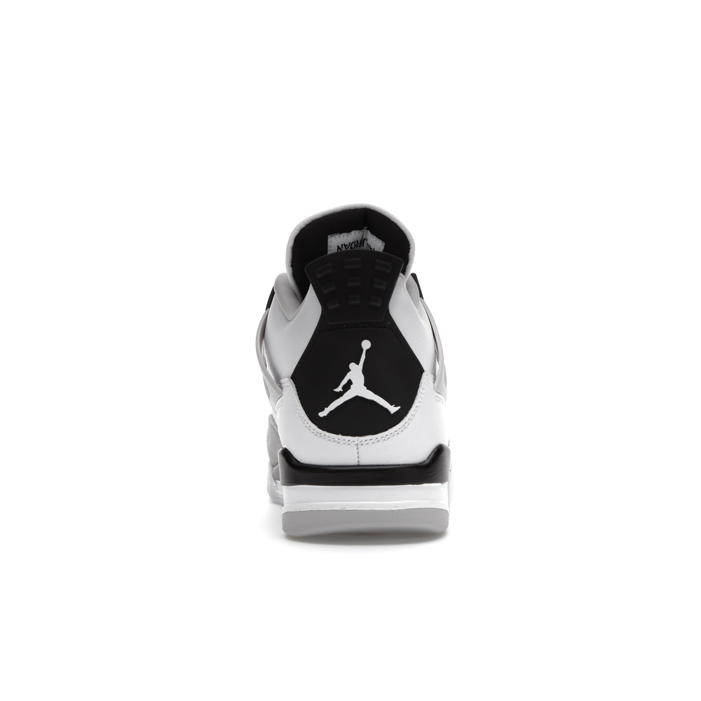 Drawing inspiration from the Air Jordan 4 Military Blue, the Military Black version boasts a smooth white leather upper, complemented by a light grey Durabuck toe wrap and netted TPU inserts. The Military Black eyelets, heel tabs, and underlays provide a striking contrast to the clean upper. The design is finished off with a white, black, and light grey sole, featuring a visible Air unit for added comfort and style.