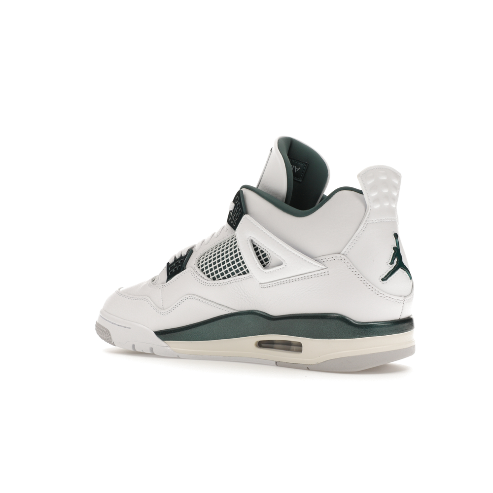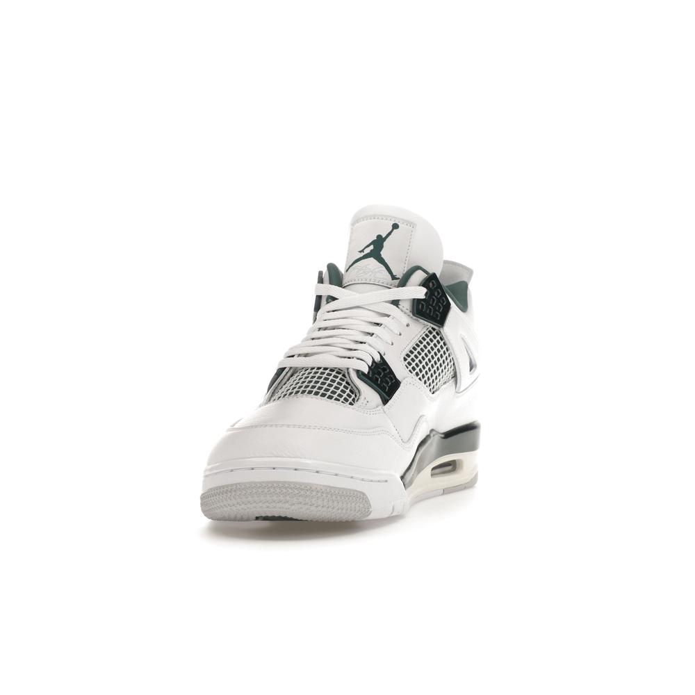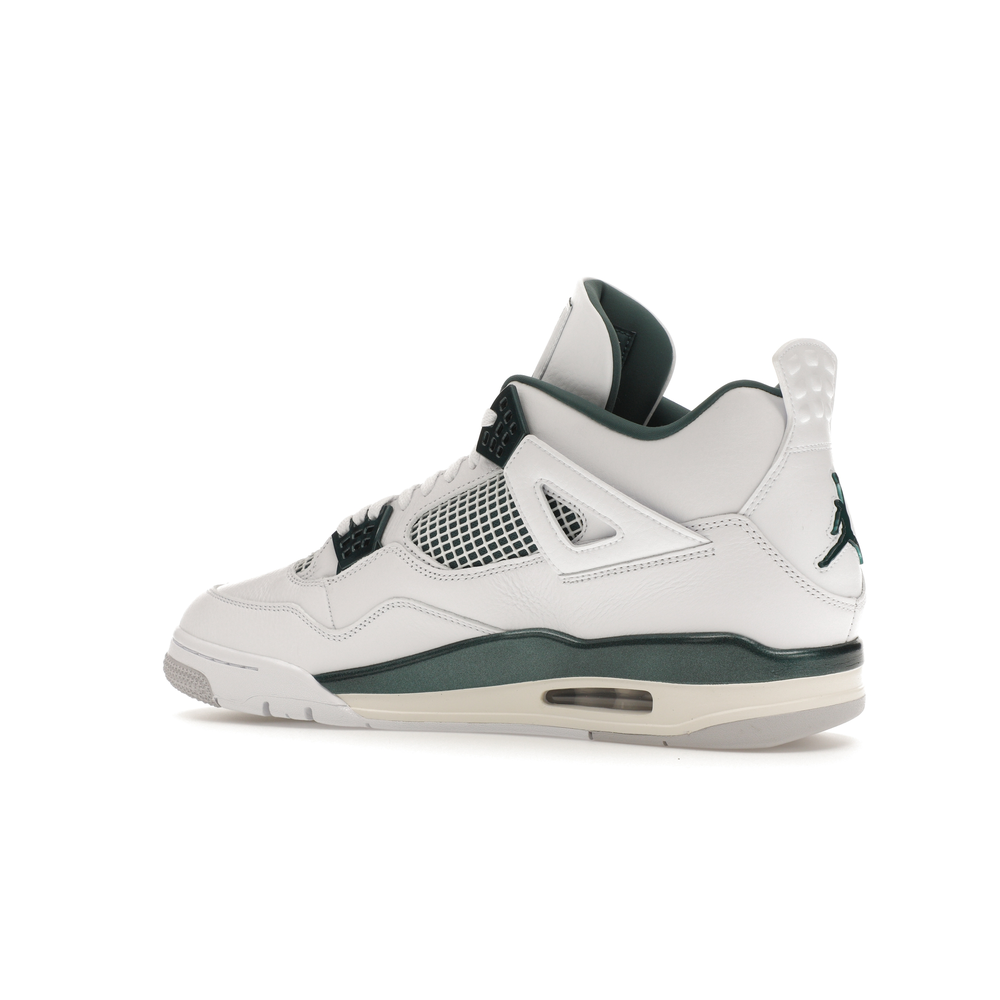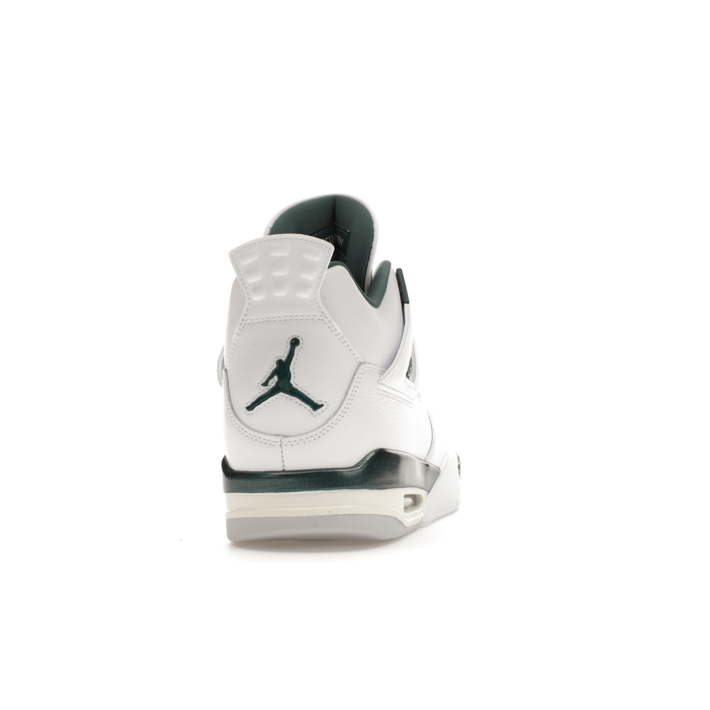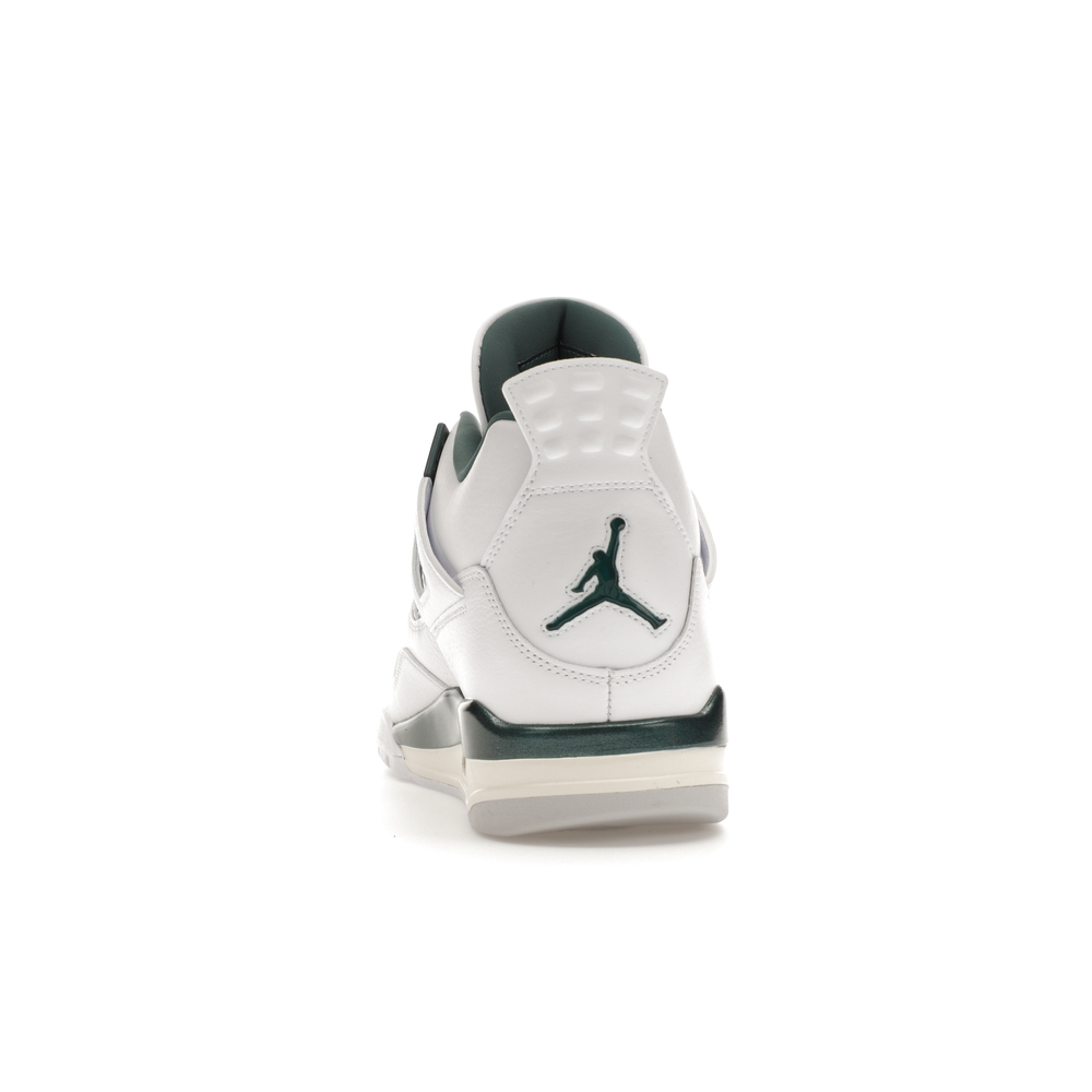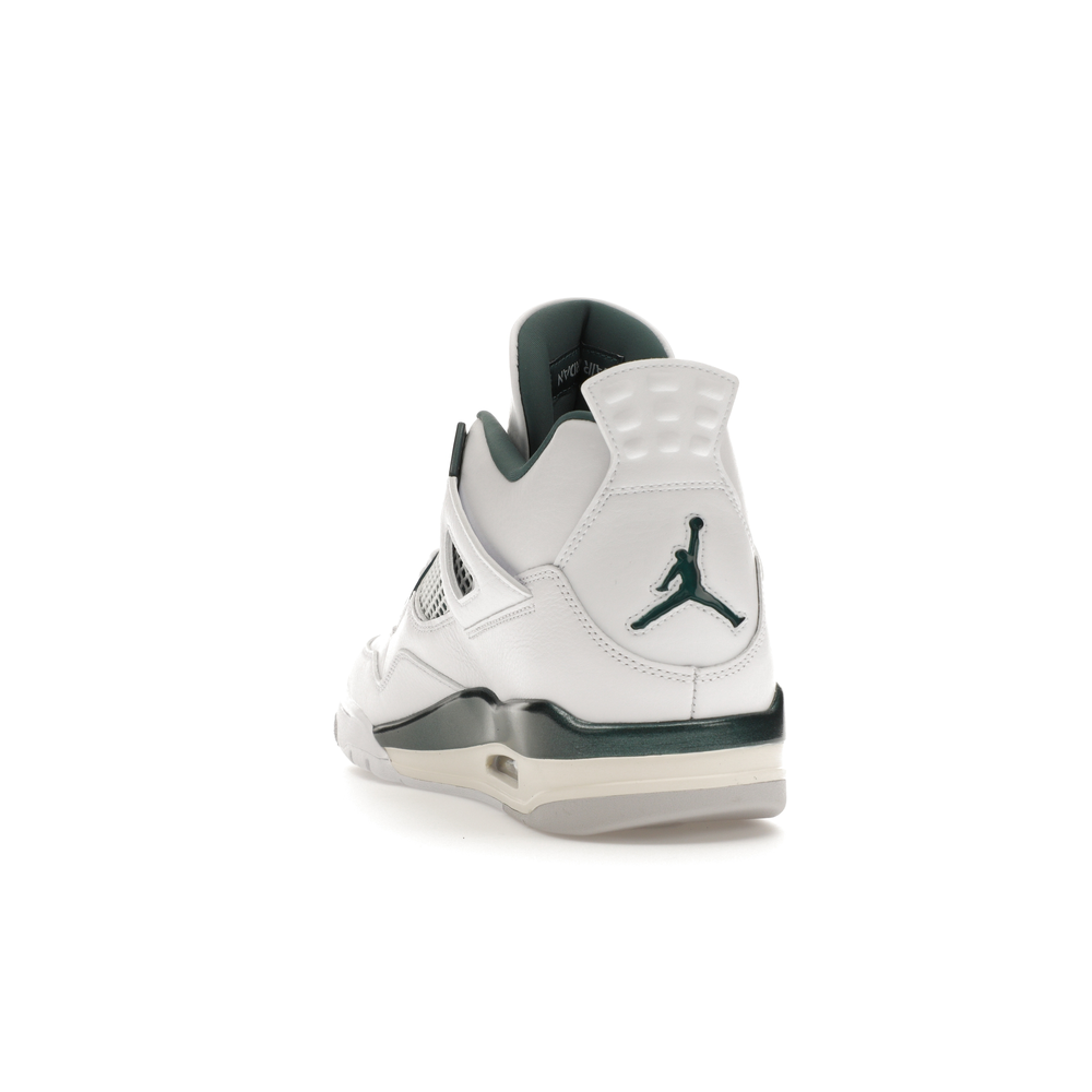 The upper features crisp White and deep Oxidized Green, giving the sneaker a retro, varsity-sports-inspired look. The base is crafted from smooth White leather with tonal overlay panels and wavy rows of stitching. Oxidized Green accents appear on the floating, web-like eyestays, synthetic collar lining, sockliner, tongue tag Jumpman logo, heel Jumpman, and a midsole strip. As with other Jordan 4 Retro models, this version includes visible air units in the heel for cushioning.