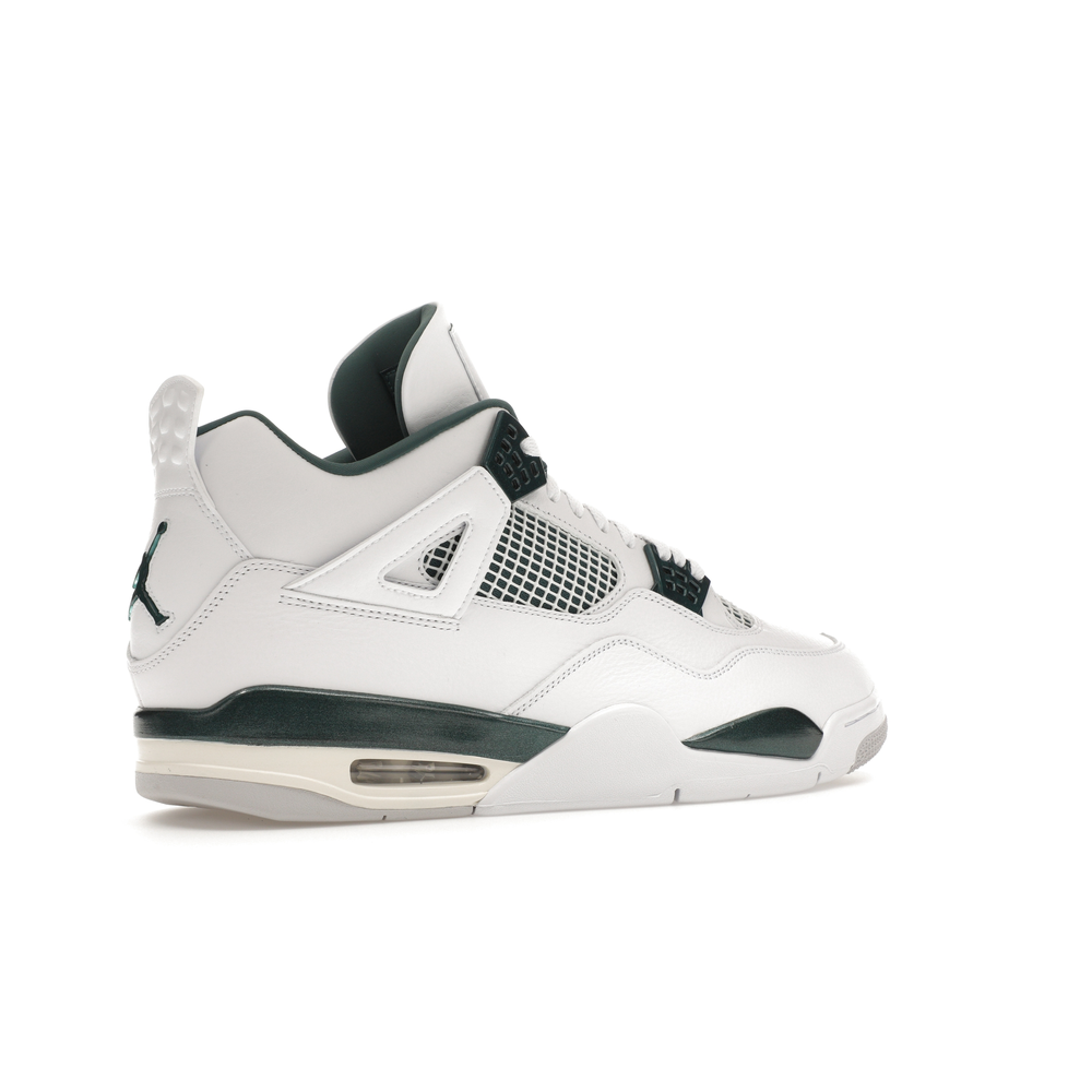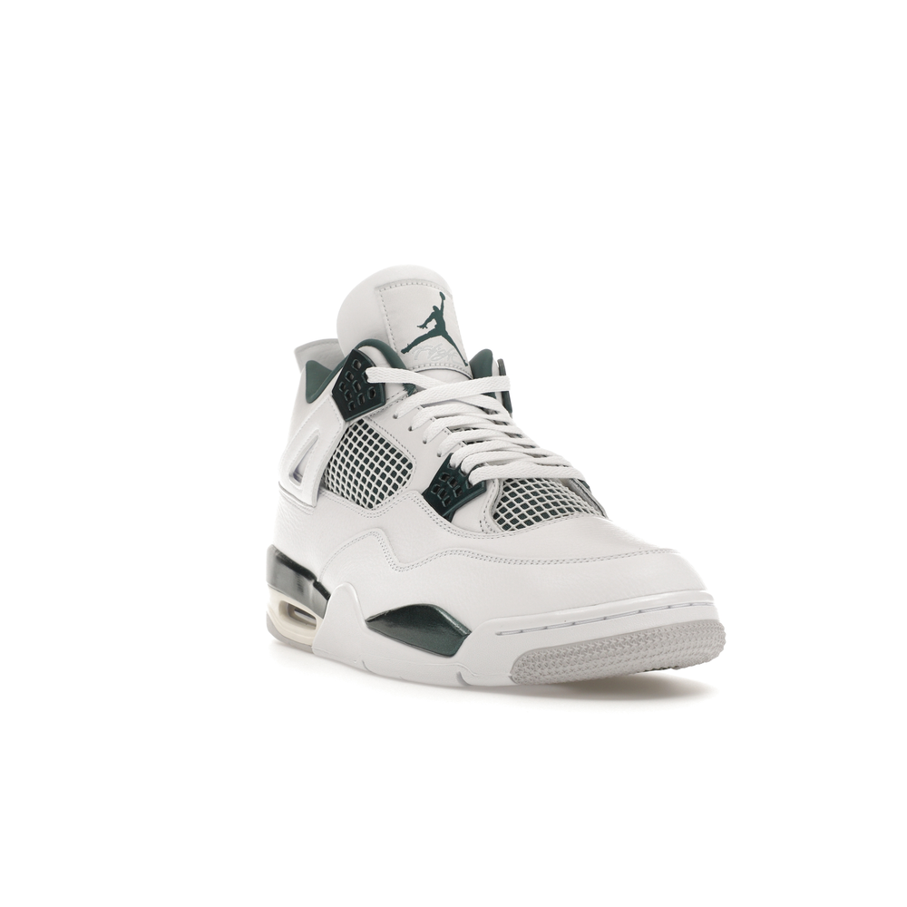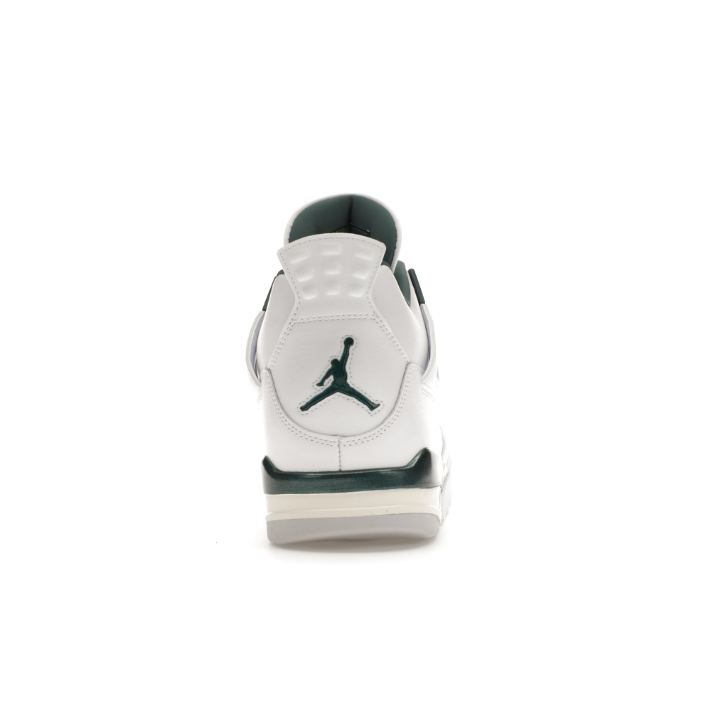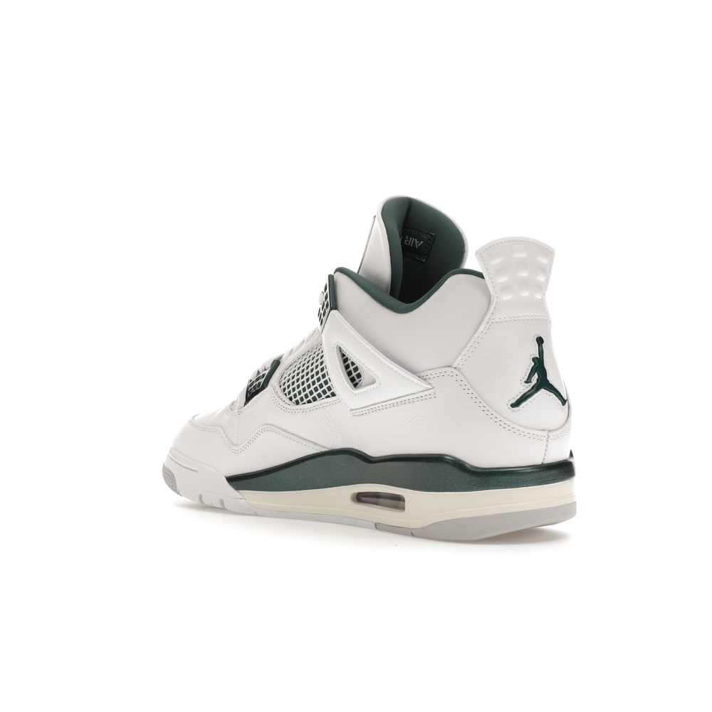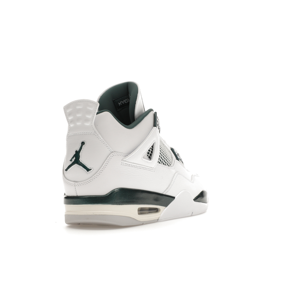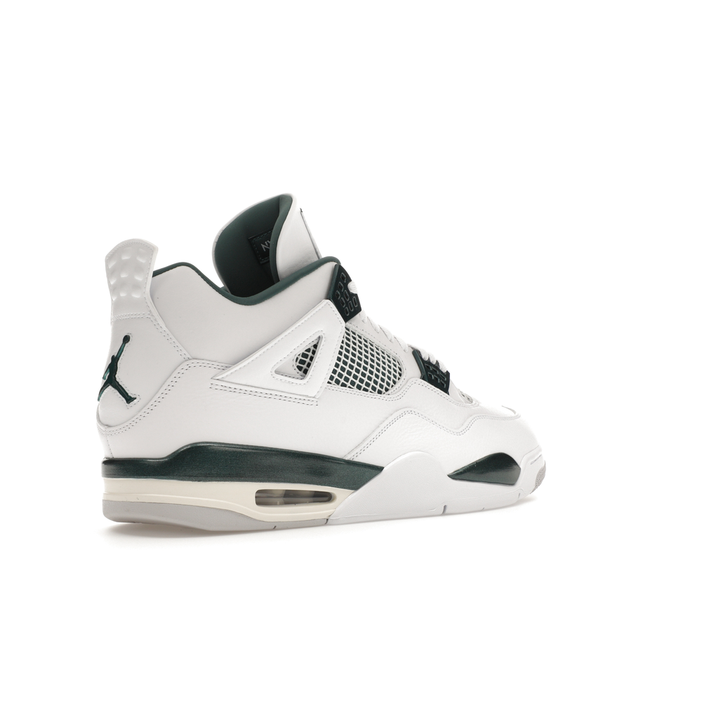 The upper features crisp White and deep Oxidized Green, giving the sneaker a retro, varsity-sports-inspired look. The base is crafted from smooth White leather with tonal overlay panels and wavy rows of stitching. Oxidized Green accents appear on the floating, web-like eyestays, synthetic collar lining, sockliner, tongue tag Jumpman logo, heel Jumpman, and a midsole strip. As with other Jordan 4 Retro models, this version includes visible air units in the heel for cushioning.