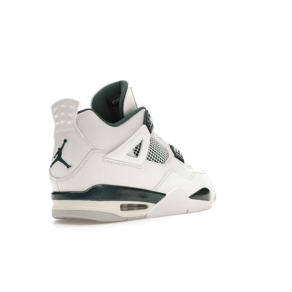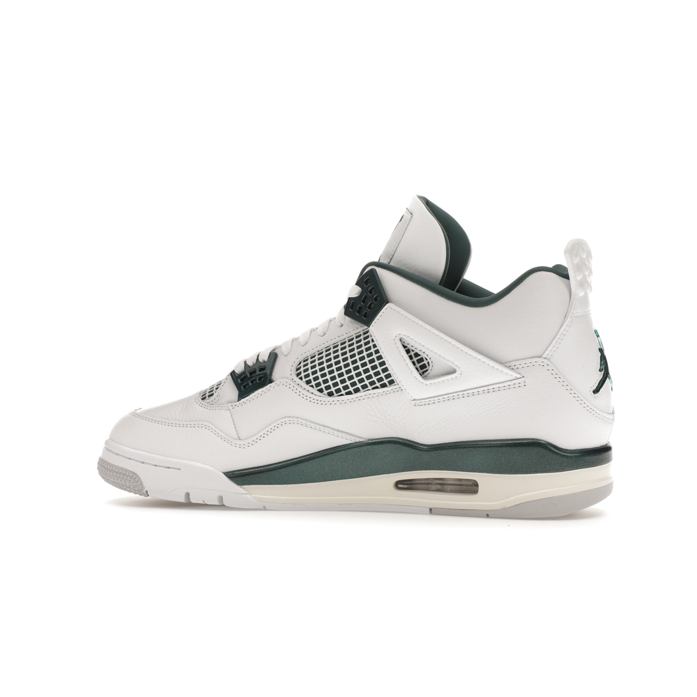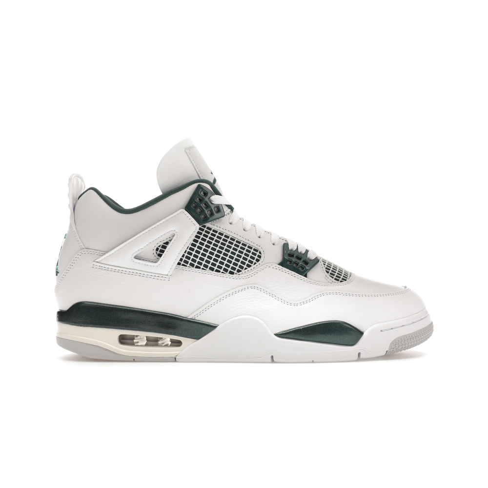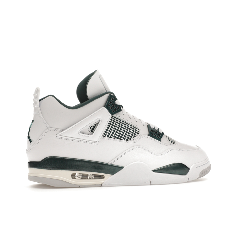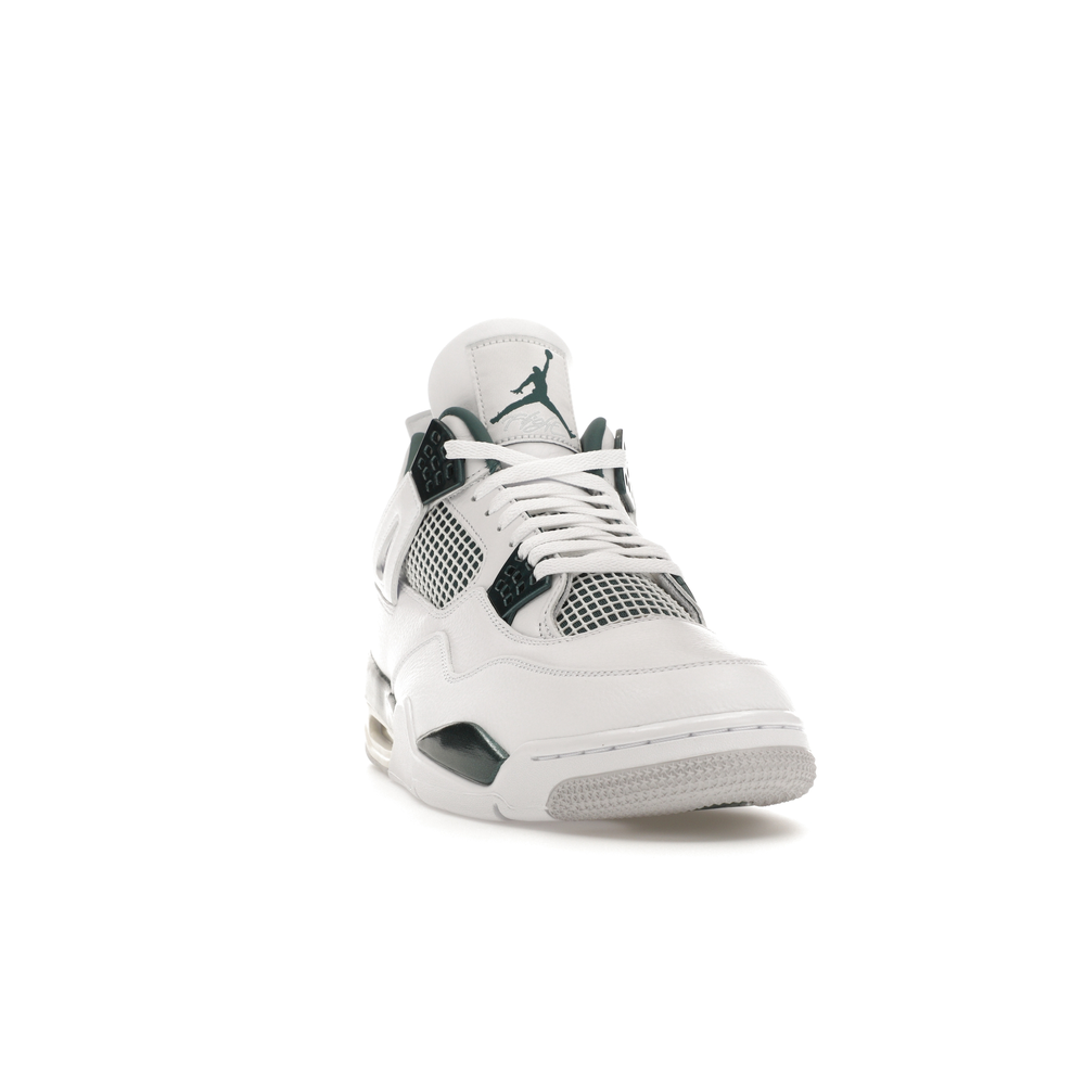 The upper features crisp White and deep Oxidized Green, giving the sneaker a retro, varsity-sports-inspired look. The base is crafted from smooth White leather with tonal overlay panels and wavy rows of stitching. Oxidized Green accents appear on the floating, web-like eyestays, synthetic collar lining, sockliner, tongue tag Jumpman logo, heel Jumpman, and a midsole strip. As with other Jordan 4 Retro models, this version includes visible air units in the heel for cushioning.