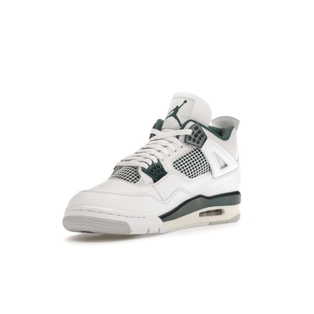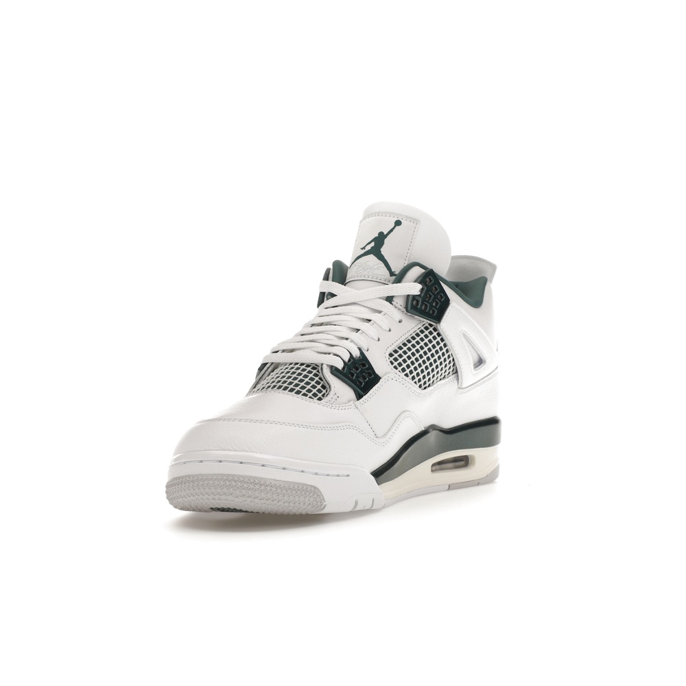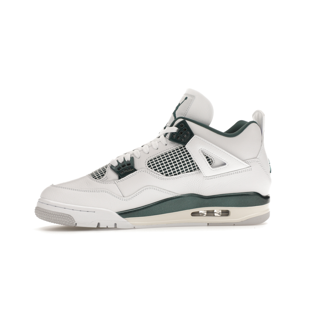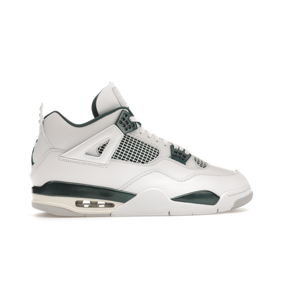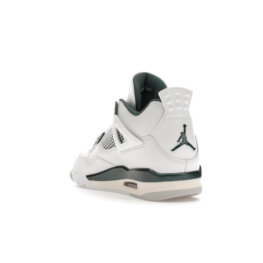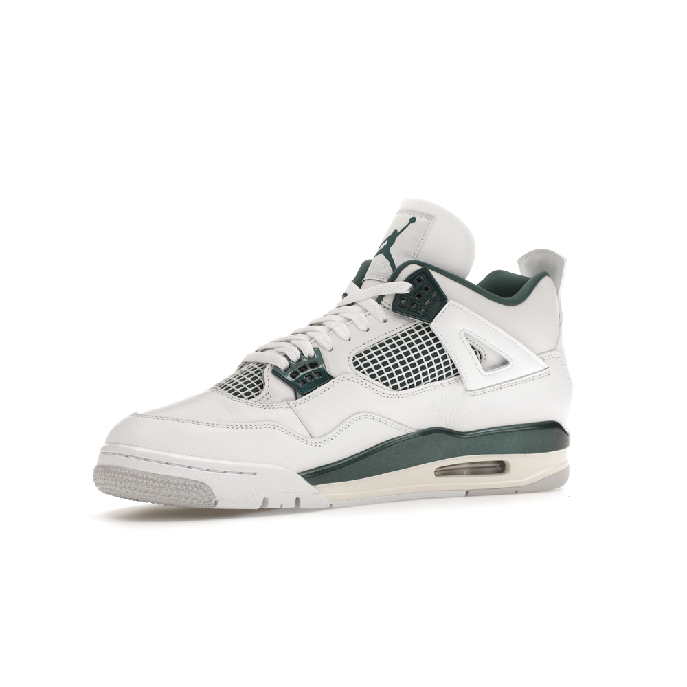 The upper features crisp White and deep Oxidized Green, giving the sneaker a retro, varsity-sports-inspired look. The base is crafted from smooth White leather with tonal overlay panels and wavy rows of stitching. Oxidized Green accents appear on the floating, web-like eyestays, synthetic collar lining, sockliner, tongue tag Jumpman logo, heel Jumpman, and a midsole strip. As with other Jordan 4 Retro models, this version includes visible air units in the heel for cushioning.