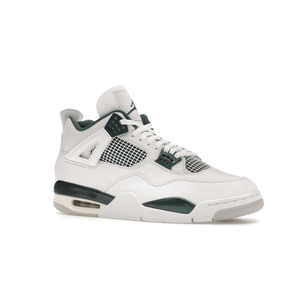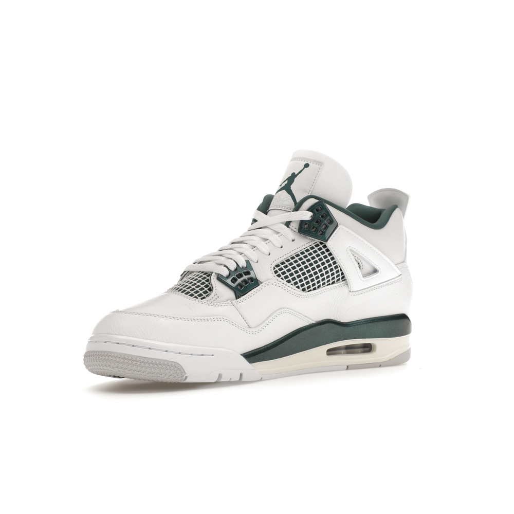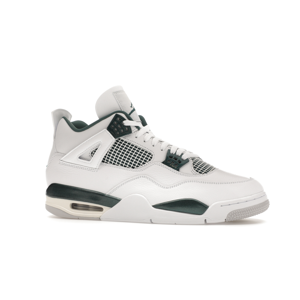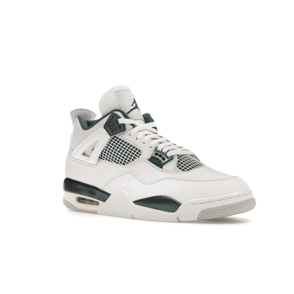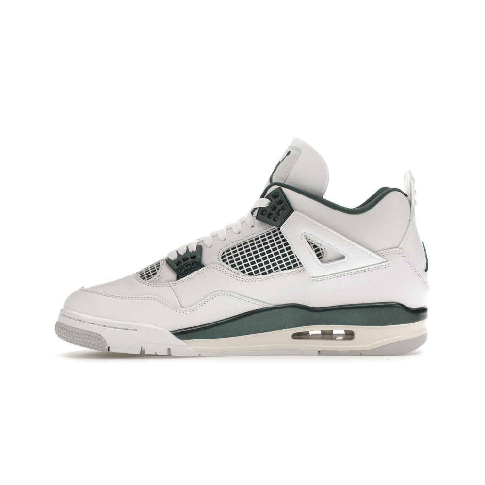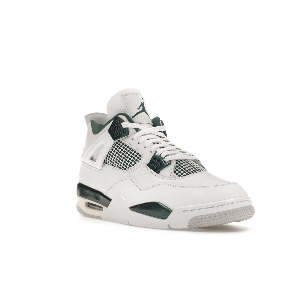 The upper features crisp White and deep Oxidized Green, giving the sneaker a retro, varsity-sports-inspired look. The base is crafted from smooth White leather with tonal overlay panels and wavy rows of stitching. Oxidized Green accents appear on the floating, web-like eyestays, synthetic collar lining, sockliner, tongue tag Jumpman logo, heel Jumpman, and a midsole strip. As with other Jordan 4 Retro models, this version includes visible air units in the heel for cushioning.