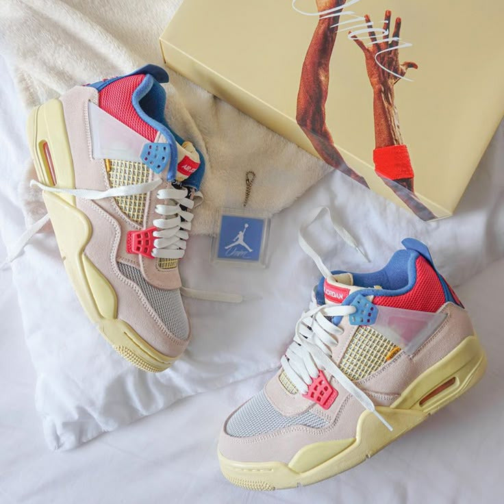 The design is a beautiful, creative Frankenstein. It takes the iconic Air Jordan 4 silhouette and gives it a new, deconstructed soul. A soft, "Guava Ice" pink suede provides a warm, unique base. This is then accented with a vibrant blue and red. But the masterstroke is the folded-down tongue, a direct nod to how Union's owner, Chris Gibbs, used to wear his own 4s back in the day.