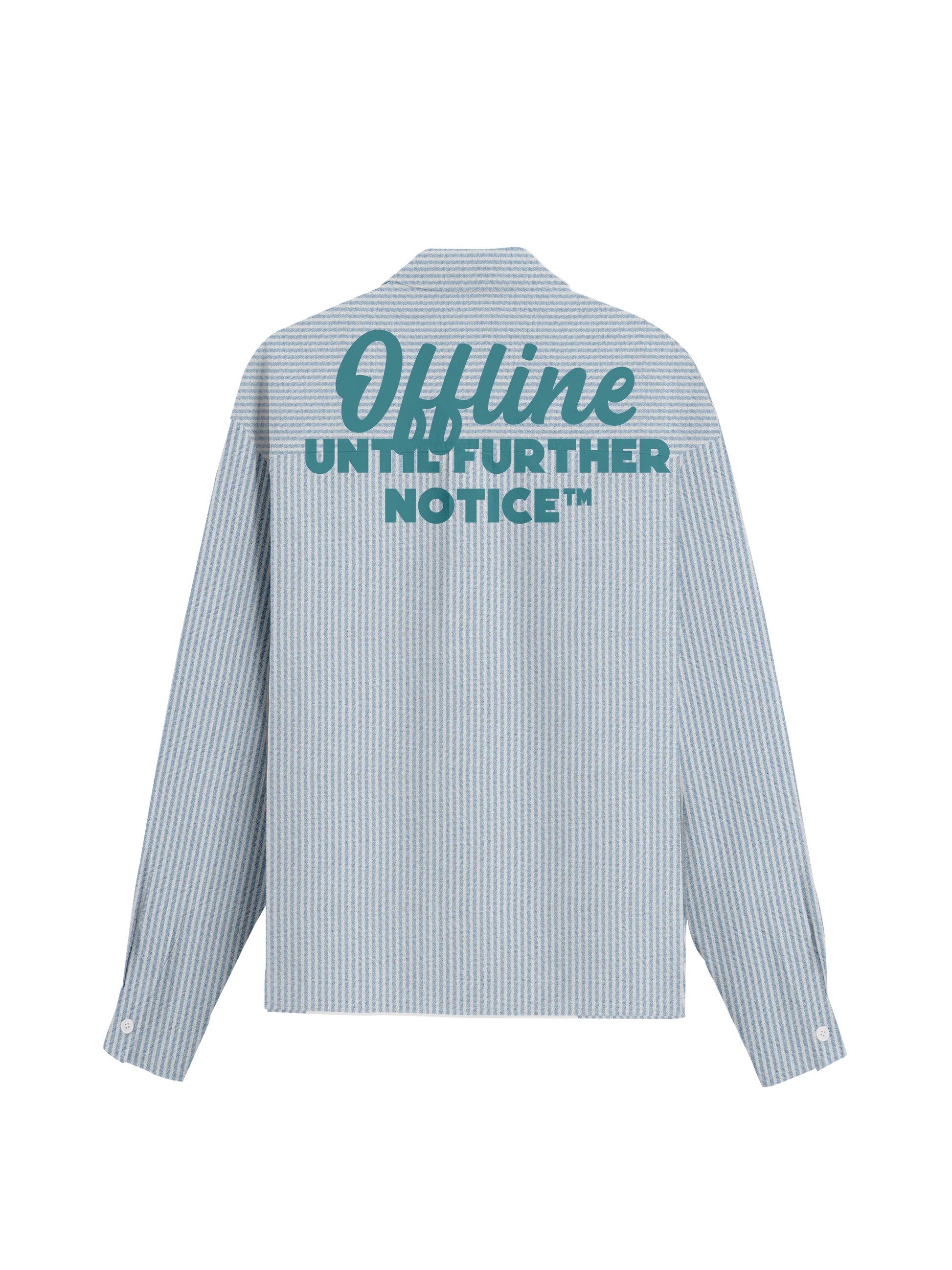 This one’s for the moments you’re not working, even if you look like you might be. With classic pinstripes, a playful ink-stain print on the pocket (courtesy of a rebellious pen), and “Offline Until Further Notice™” loud and proud on the back, this shirt lets everyone know your brain is on break.
