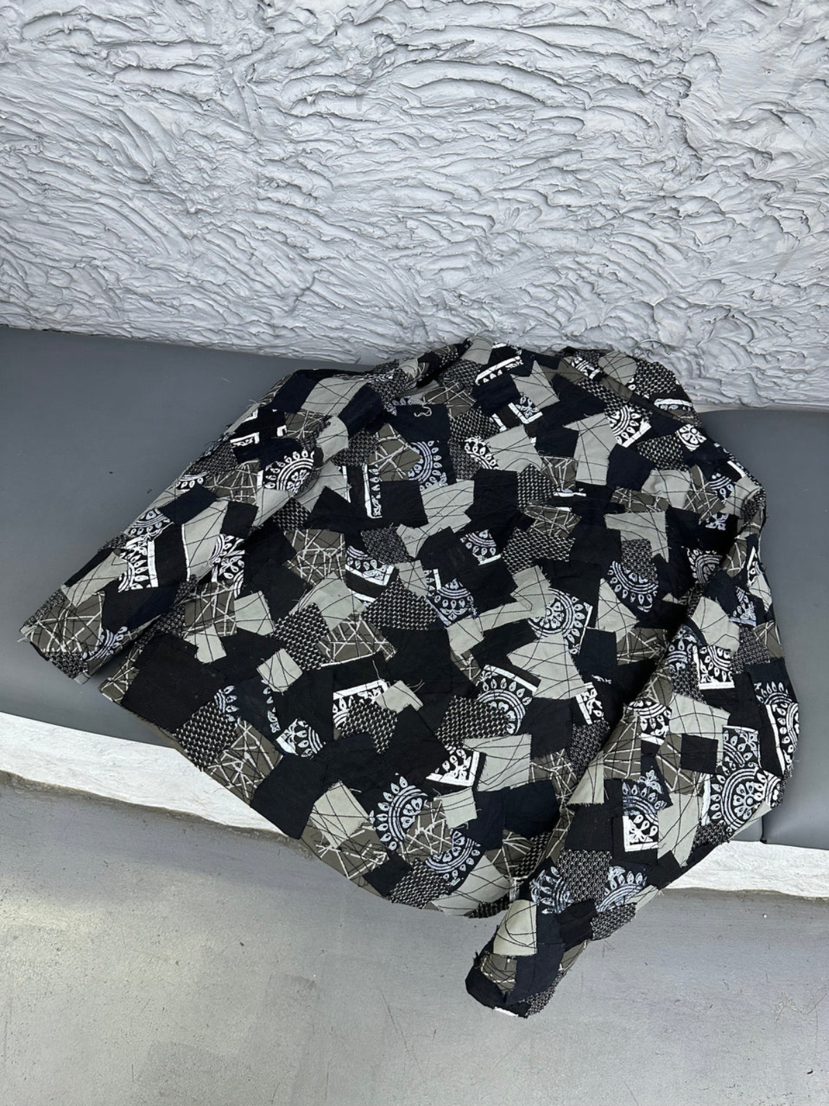 The FARDA Tahya Jacket is a bold statement of individuality and creativity. This singular piece is constructed from a curated selection of five distinct fabrics, each cut into precise square patches and thoughtfully arranged atop a black base. The fabric selection—ranging from solid grays and textured knits to block-printed patterns and repurposed floral motifs—creates a captivating interplay of light and shadow. The deliberate juxtaposition of these materials results in a visually arresting tableau, where varying tones and textures converge to form a cohesive yet dynamic design. The meticulous application of black thread stitching over the patchwork enhances the jacket's dimensionality, while the signature FARDA embroidered patch provides a mark of authenticity. The Tahya Jacket is a wearable testament to FARDA's commitment to handcrafted, avant-garde design.