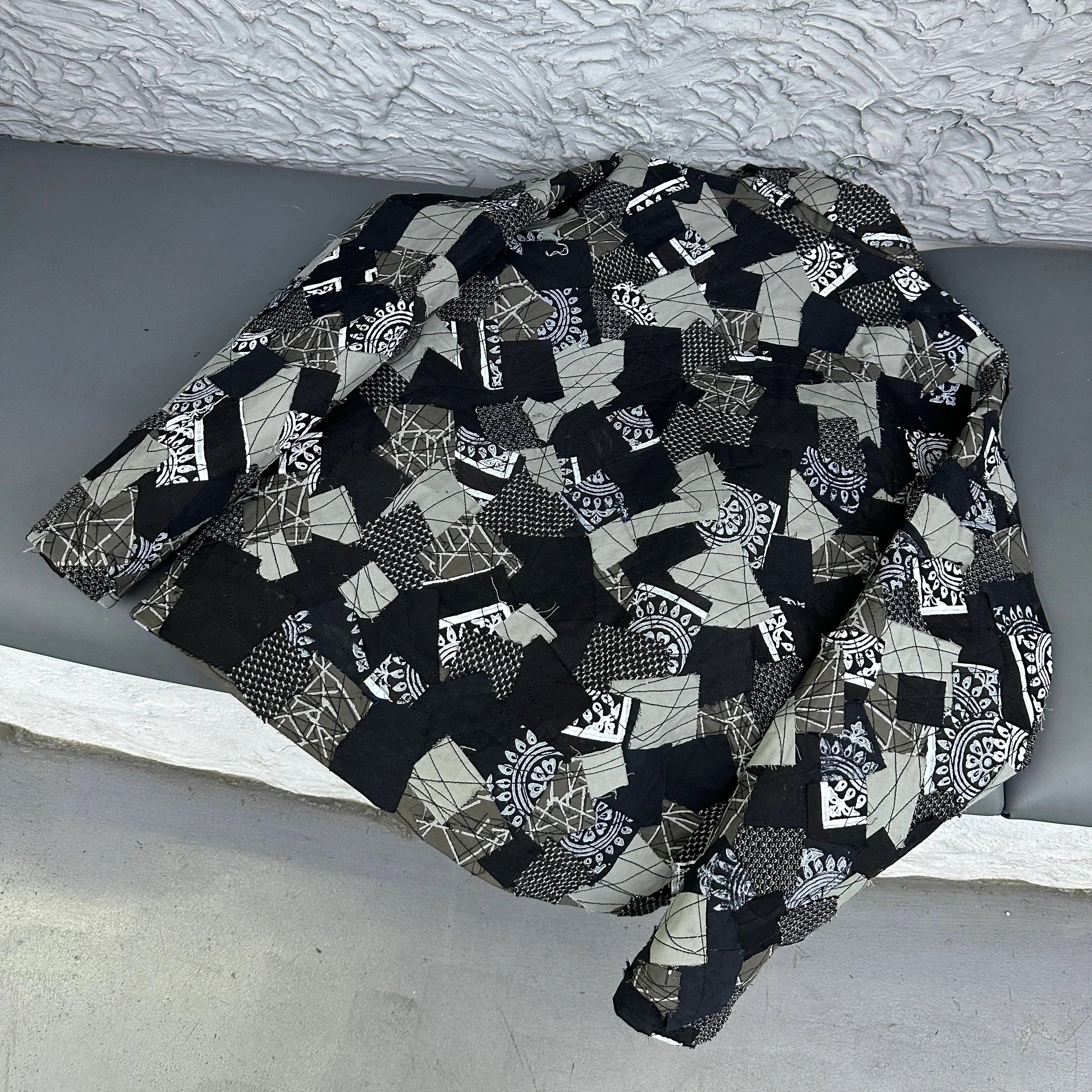 The FARDA Tahya Jacket is a bold statement of individuality and creativity. This singular piece is constructed from a curated selection of five distinct fabrics, each cut into precise square patches and thoughtfully arranged atop a black base. The fabric selection—ranging from solid grays and textured knits to block-printed patterns and repurposed floral motifs—creates a captivating interplay of light and shadow. The deliberate juxtaposition of these materials results in a visually arresting tableau, where varying tones and textures converge to form a cohesive yet dynamic design. The meticulous application of black thread stitching over the patchwork enhances the jacket's dimensionality, while the signature FARDA embroidered patch provides a mark of authenticity. The Tahya Jacket is a wearable testament to FARDA's commitment to handcrafted, avant-garde design.