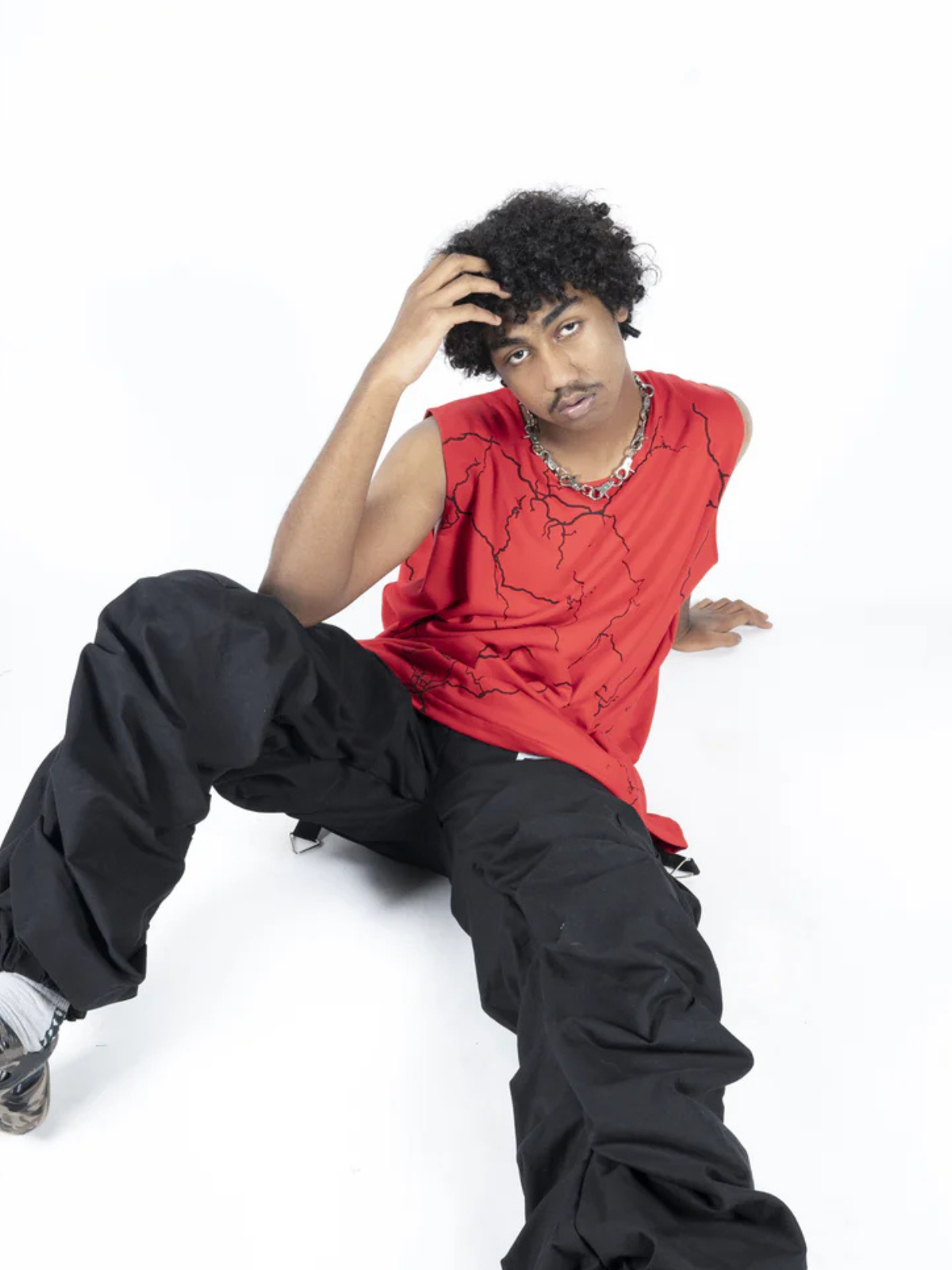 What sets the TEMPEST TSHIRT apart is its adaptability. The top layer effortlessly detaches, offering the wearer the option to style it as a standalone statement piece. The bottom layer, a sleek sleeveless tank top in matching scarlet red, mirrors the captivating tempest screenprint, creating a harmonious aesthetic across the two pieces. Crafted with meticulous attention to detail, the TEMPEST TSHIRT boasts a robust construction from 240 GSM PC terry fabric, ensuring both durability and comfort.