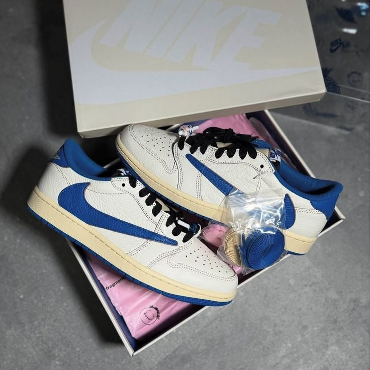 This Fragment x Travis Scott AJ1 Low pairs muted sail tones with military blue accents.