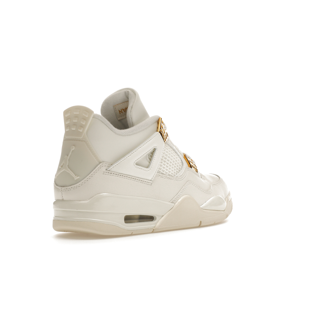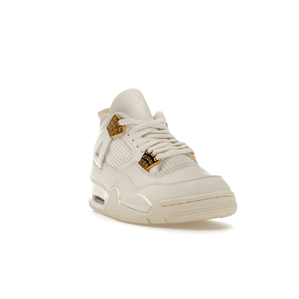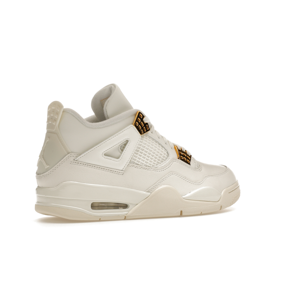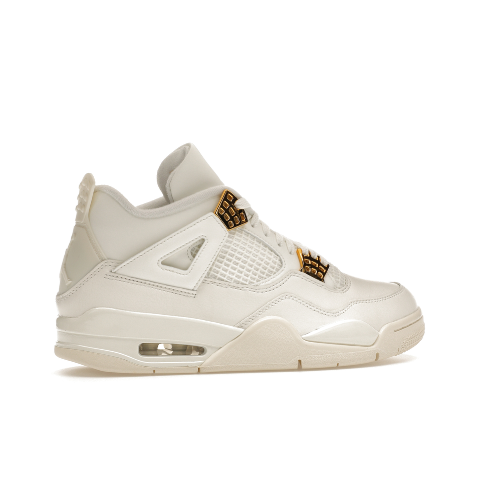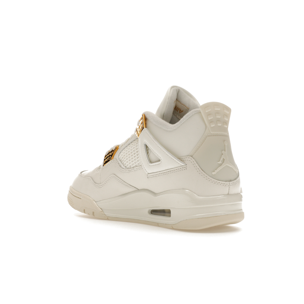 The Jordan 4 Retro Metallic Gold (Women's) elevates the classic Air Jordan 4 design with an elegant off-white Sail hue and eye-catching gold accents.