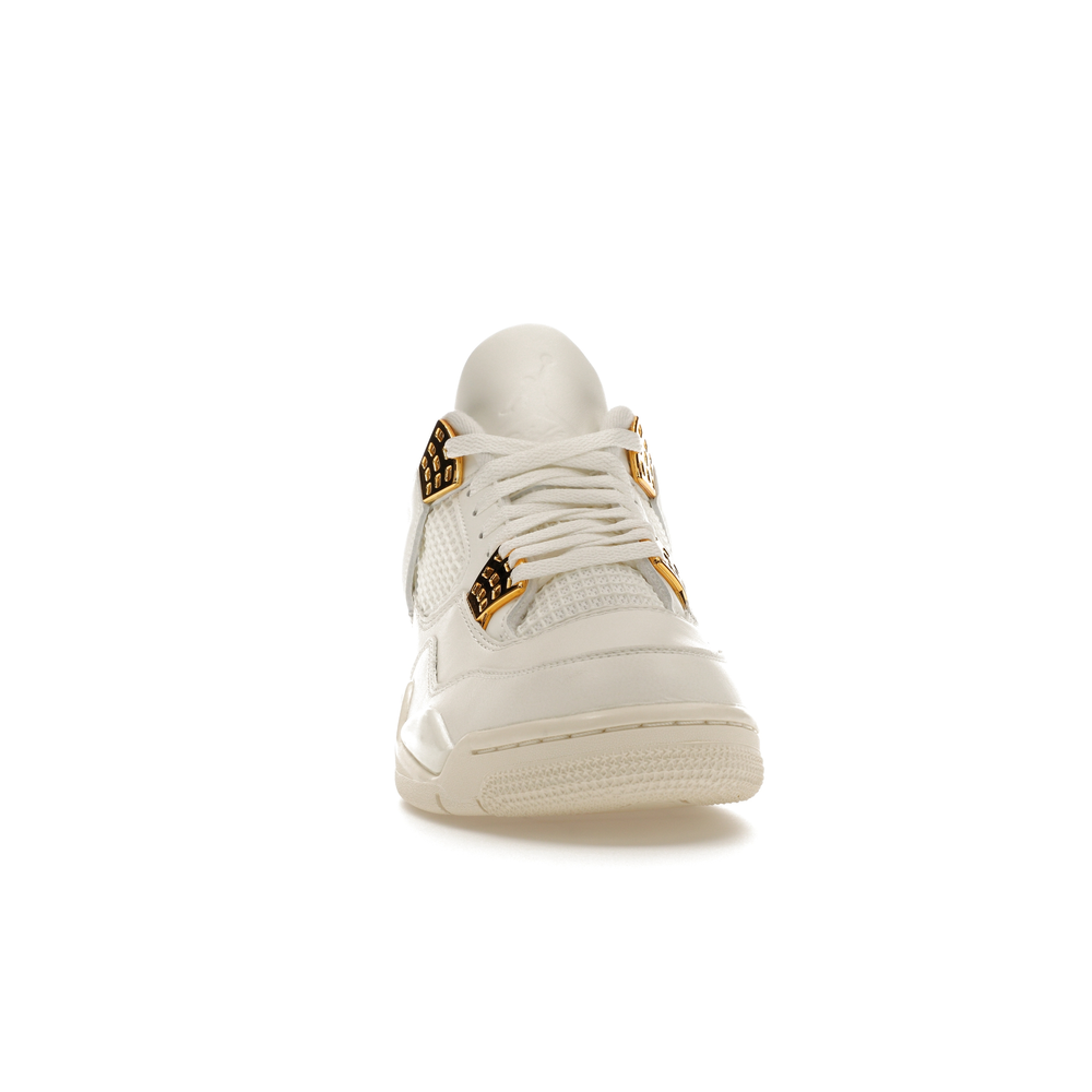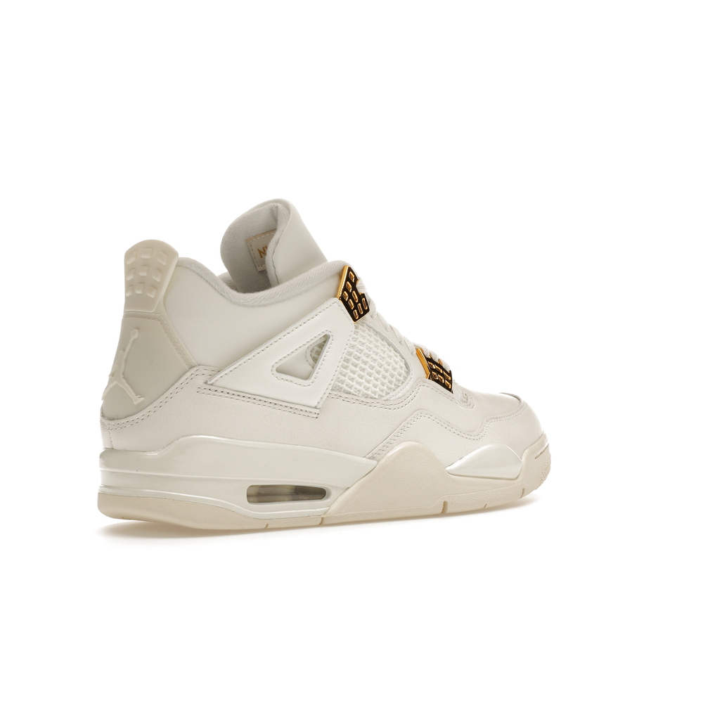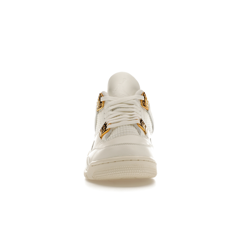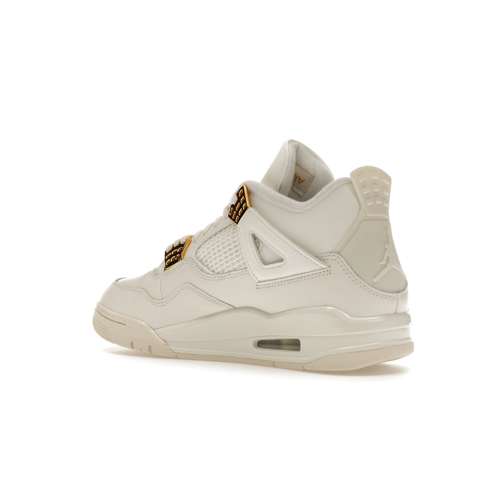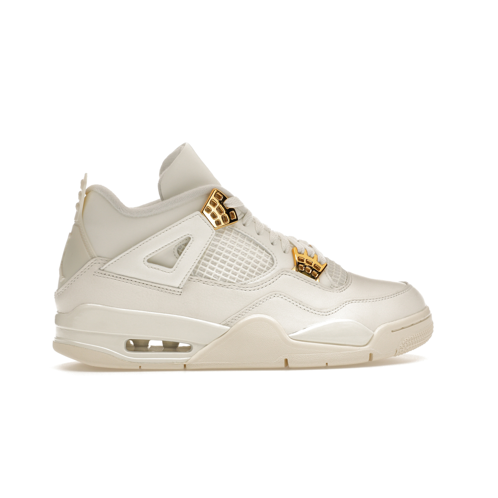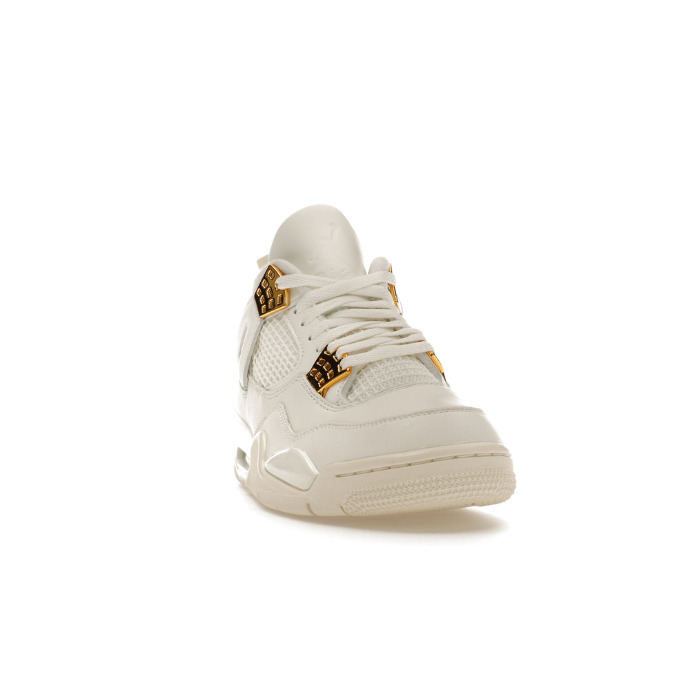 The Jordan 4 Retro Metallic Gold (Women's) elevates the classic Air Jordan 4 design with an elegant off-white Sail hue and eye-catching gold accents.