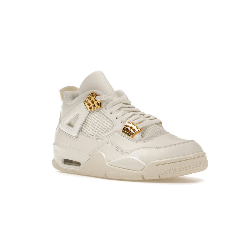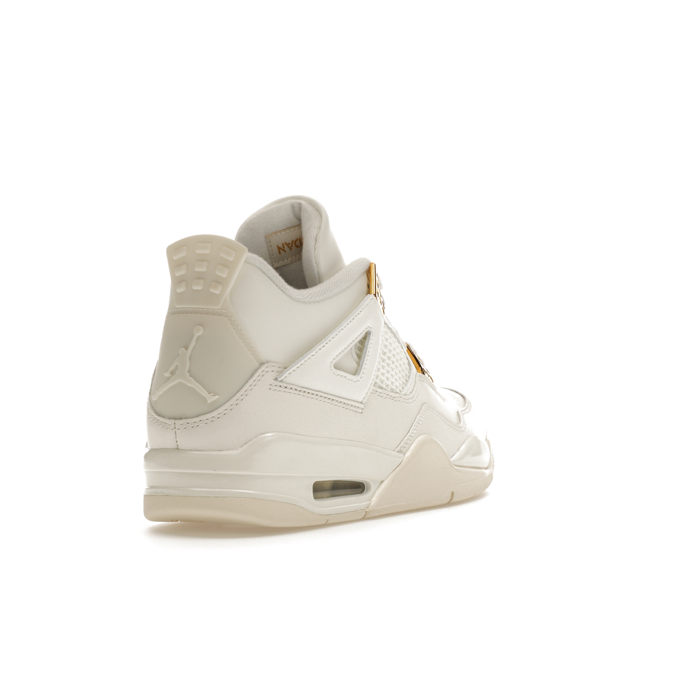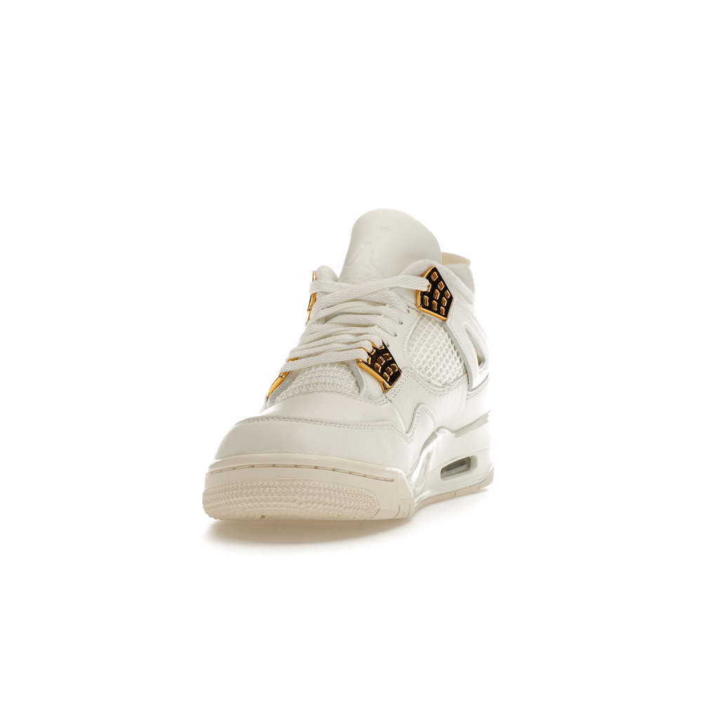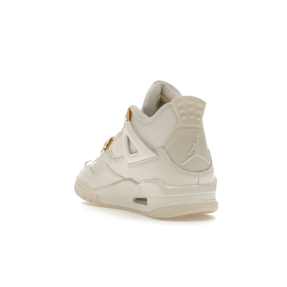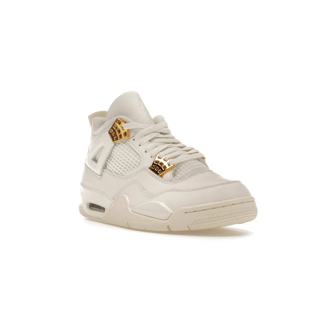 The Jordan 4 Retro Metallic Gold (Women's) elevates the classic Air Jordan 4 design with an elegant off-white Sail hue and eye-catching gold accents.