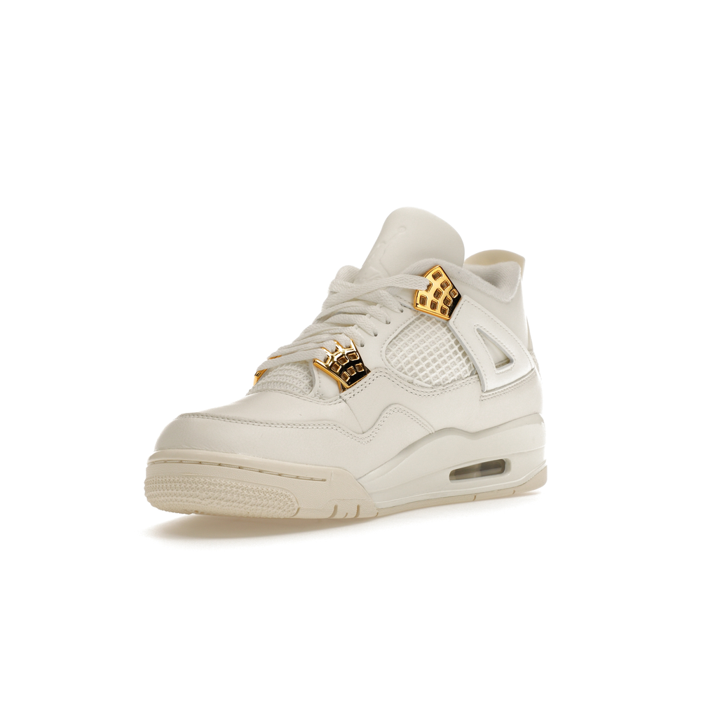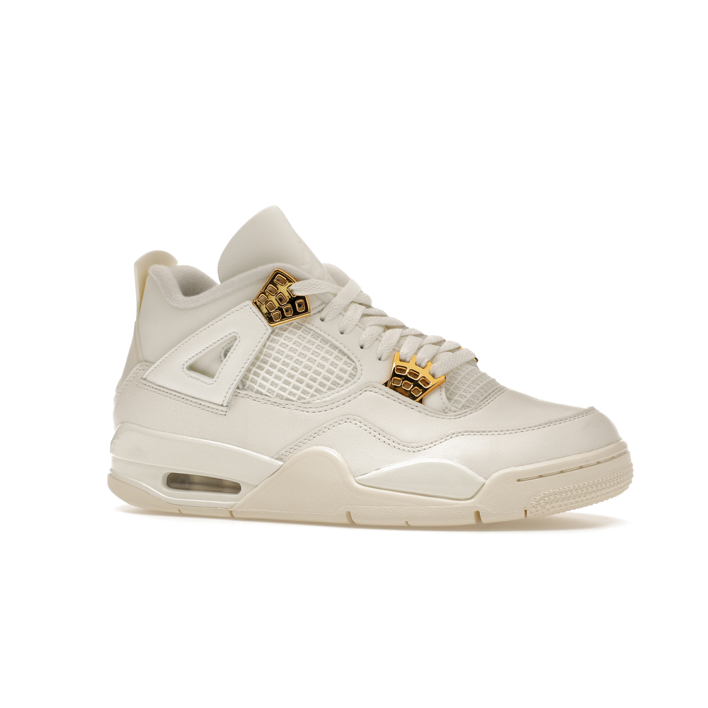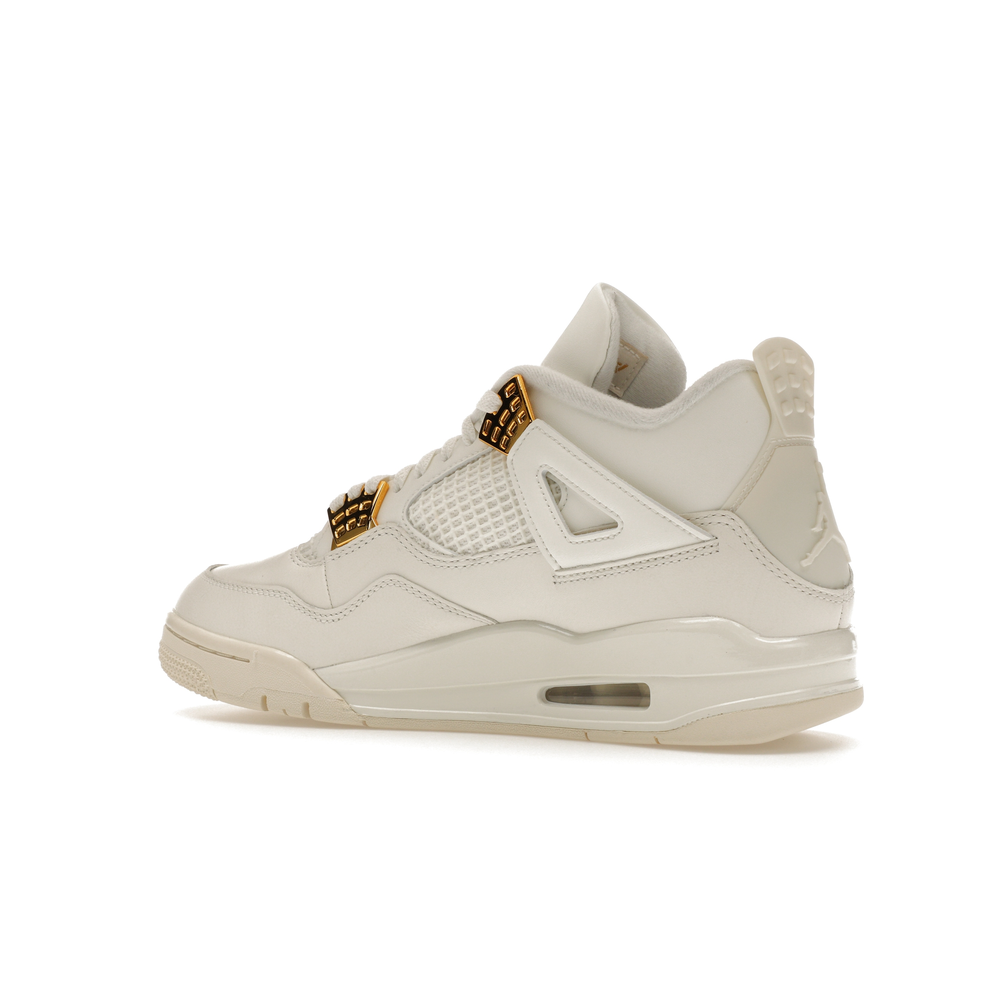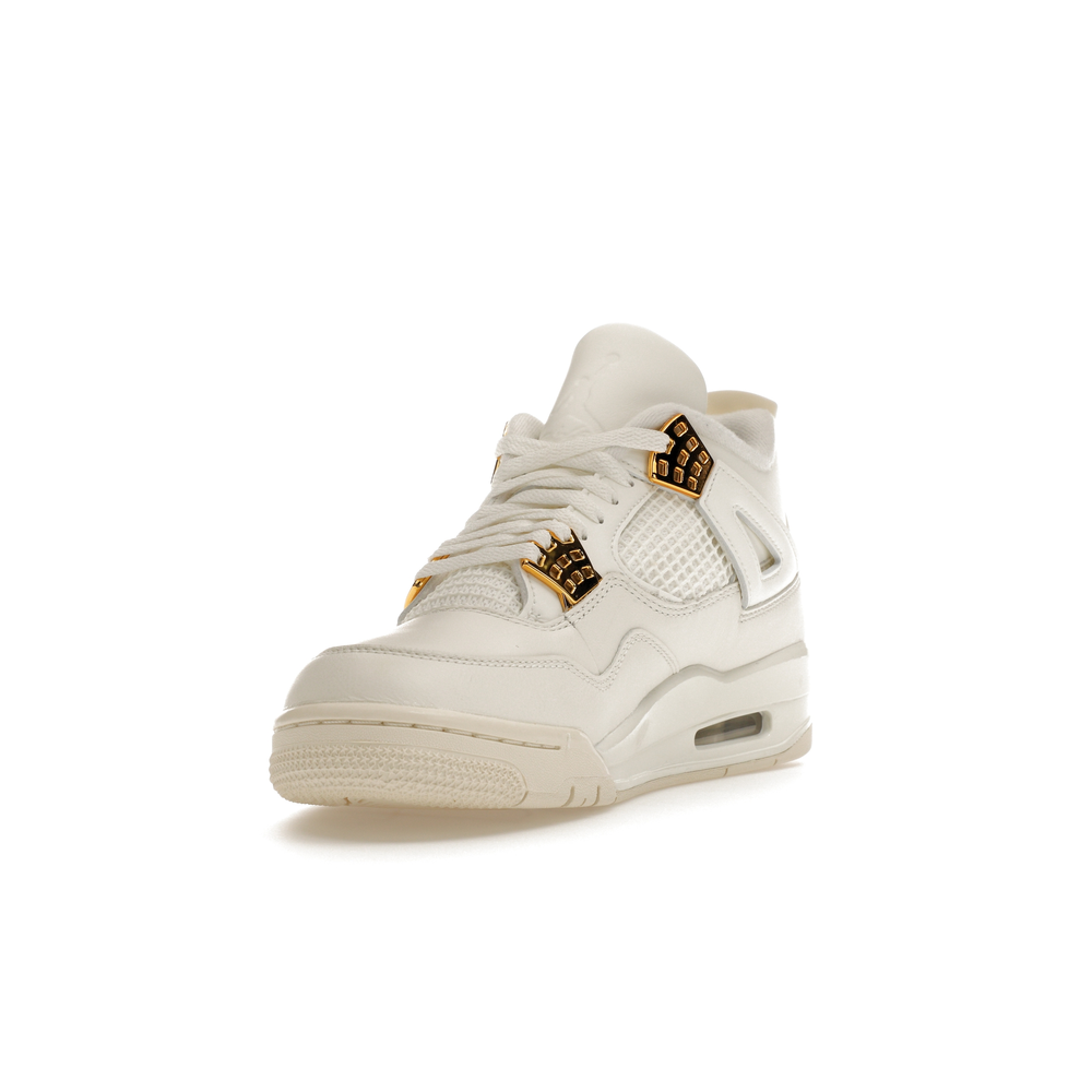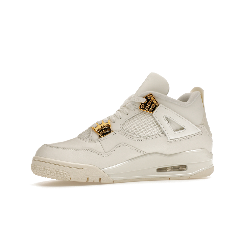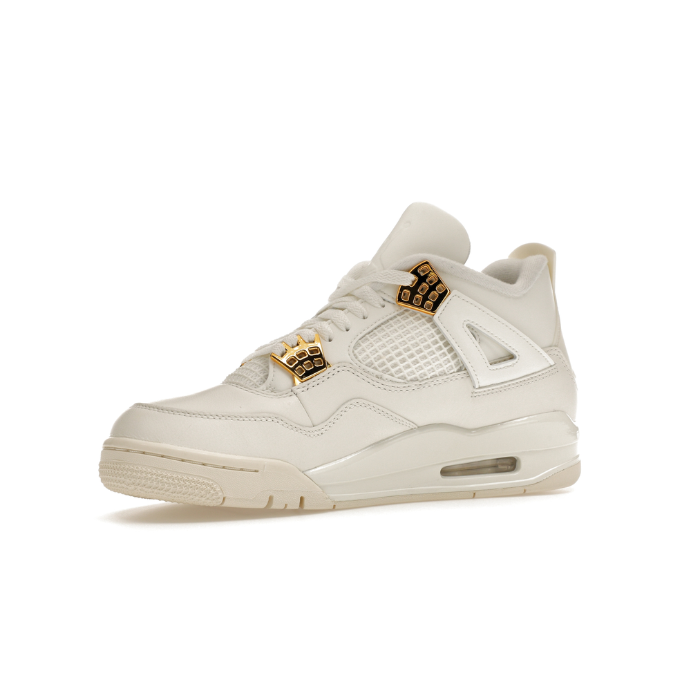 The Jordan 4 Retro Metallic Gold (Women's) elevates the classic Air Jordan 4 design with an elegant off-white Sail hue and eye-catching gold accents.