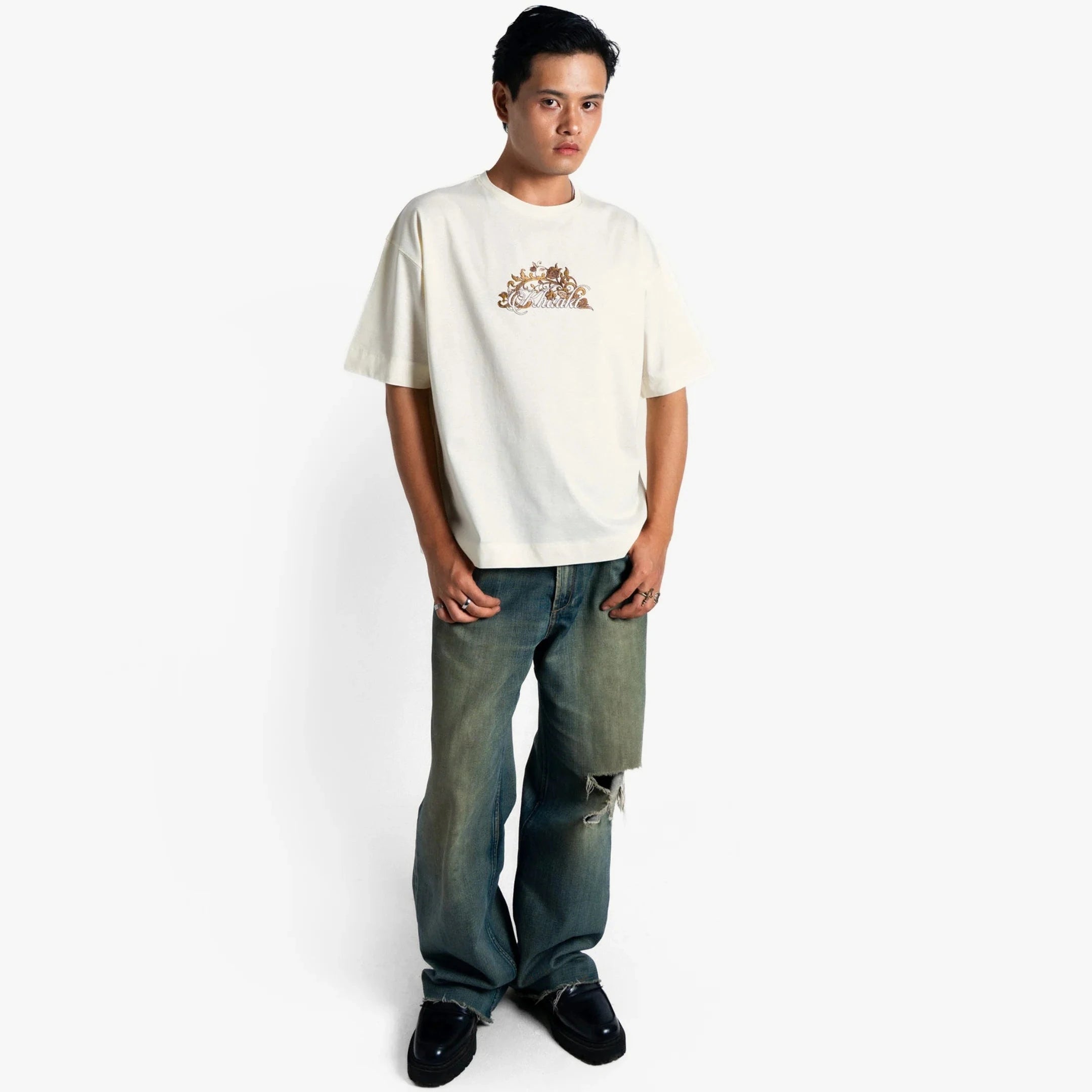 Crafted from heavyweight 100% mercerized cotton and finished with a luxurious double silicone wash, this piece showcases nearly 3 lakh embroidery stitches in earthy tones, weaving a regal scene of swans, roses, and vintage baroque flourishes. The detailed embroidery on the chest adds a refined contrast, perfectly tying in with the majestic full-back artwork.