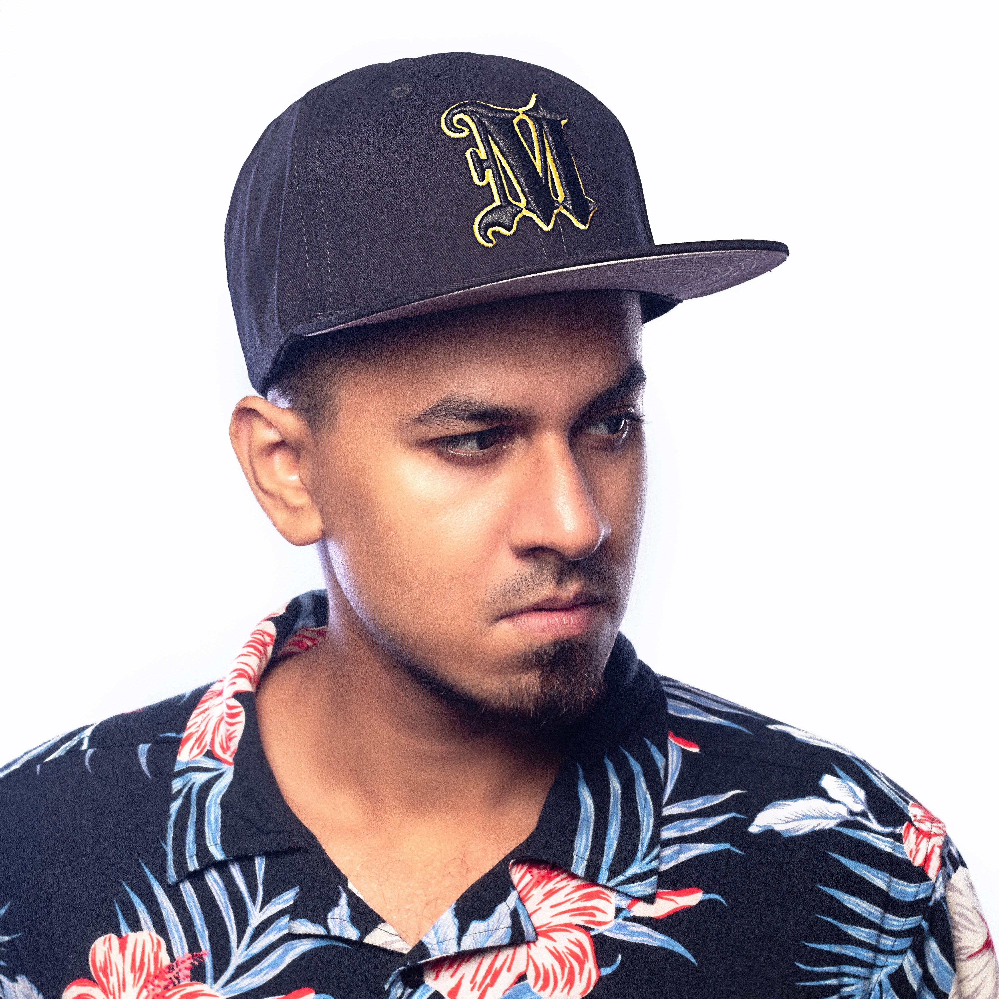 Six Panel Hip Hop snapback cap with flat brim made of high quality cotton twill. Crown is in black and visor in grey. Brand name initial "M" is embroidered in front in 3D gives a unique and cool look to the product. High quality machine embroidery is done.