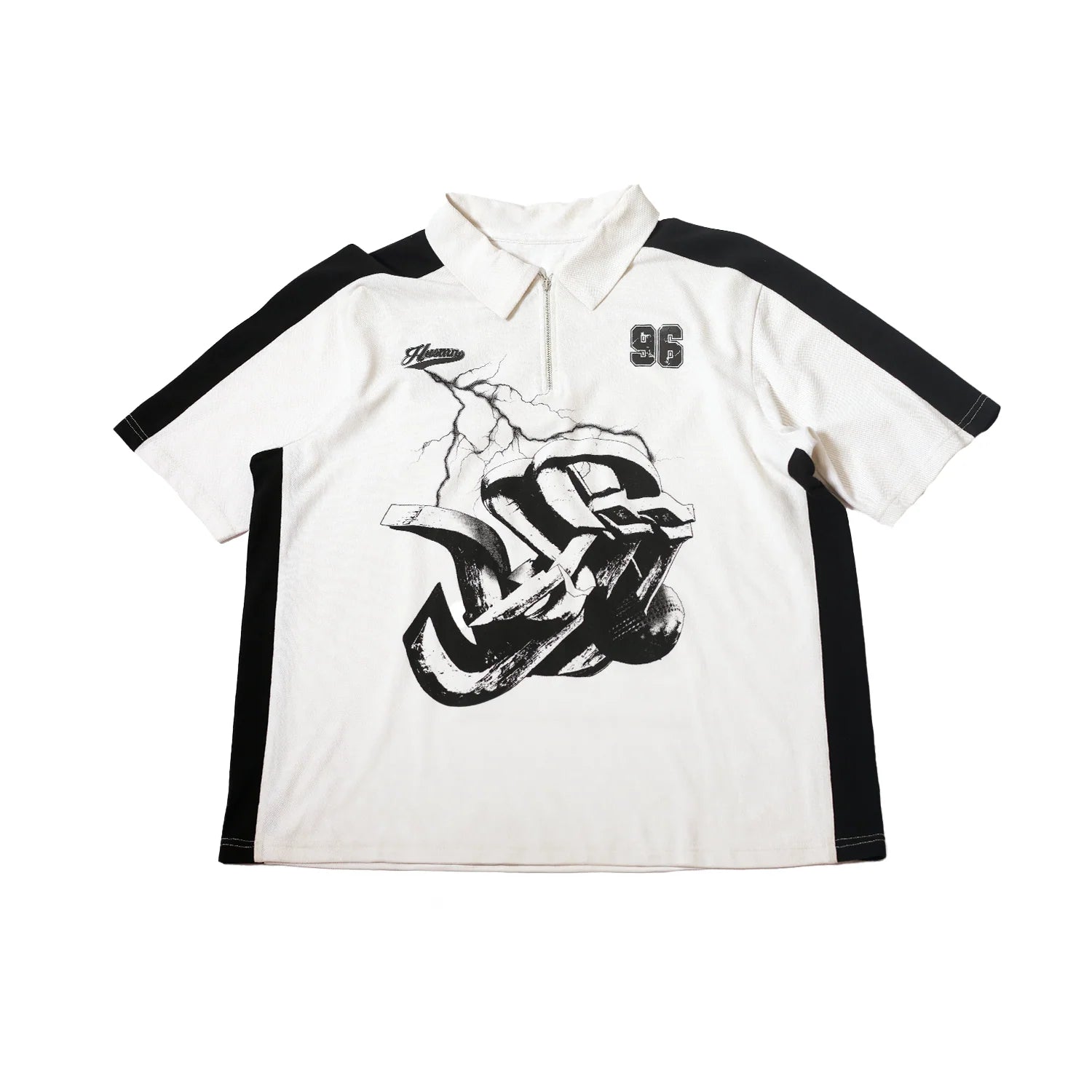 Details include a polo collar, zipper front, and a paneled design. The shirt is finished with water-based screen-printed graphics, capturing the unyielding winning spirit that defines Shreyas.